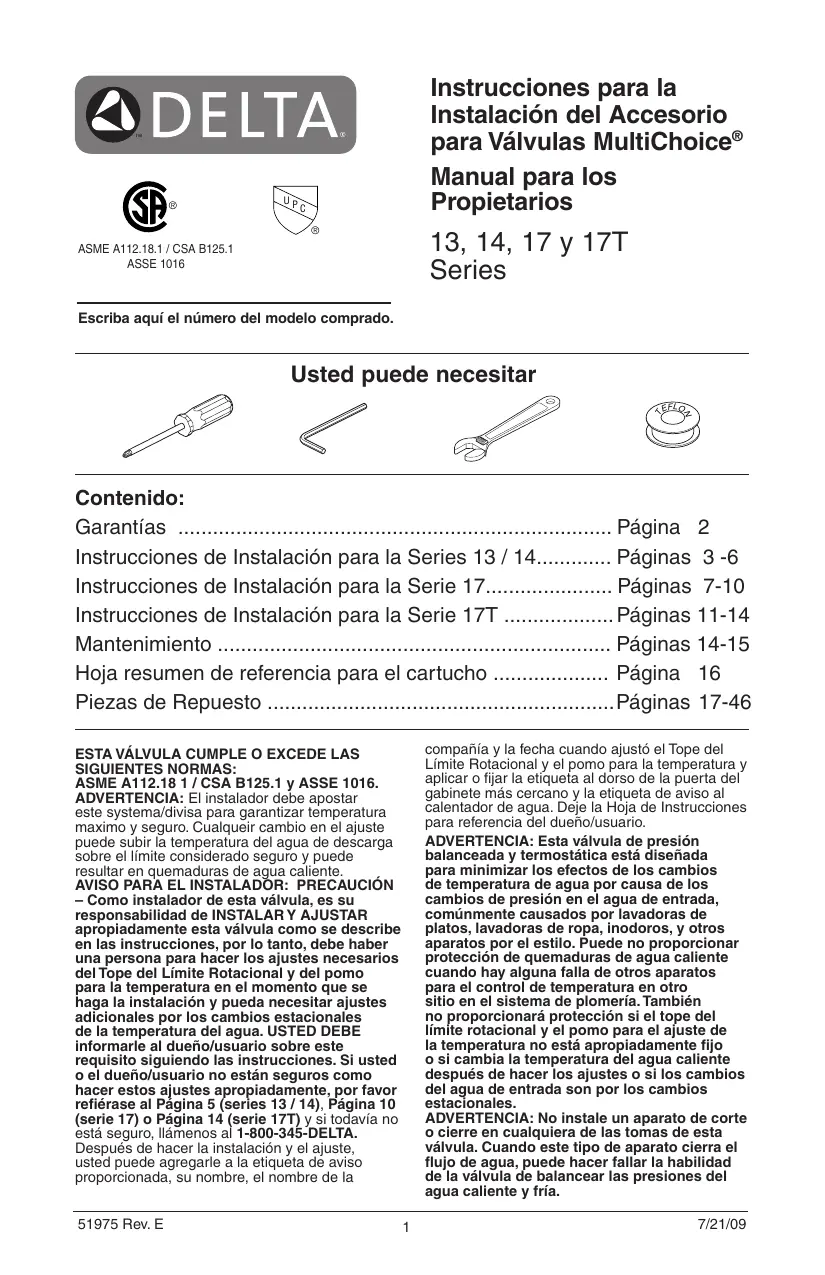 Välvula esté ajustada para que los cambios de presiôn y de temperatura en la linea no resulten en cambios_incémodos de temperatura del agua. Si el ajuste de la temperatura del calentador de agua o de la entrada de agua se cambia después de la instalaciôn de la välvula, el ajuste del tope del limite rotacional o la perilla de juste itambién se debe cam- biar! Consulte con su hoja de instrucciones de instalaciôn para saber como se ajusta 0 cambia el ajuste, o llâmenos al 1-800-345-DELTA.