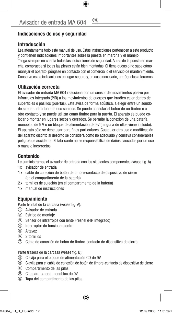 El avisador de entrada MA 604 recciona con un sensor de movimientos pasivo por infrarrojos integrado (PIR) a los movimientos de cuerpos que irradien calor bajo de superficies o pasillos (puertas). Este avisada forma acústica, a elegir entre un sonido de sirena u other toto de dos sonidos. Se pueda conectar al botón de un timbre o aanother contacto y se pueda usar como timbre para la puerta. El aparato se pueda colocar o montar en lugarares secs y cerrados. Se permitte la conexión de una bateria monobloc de 9V o un bloque de alimentación de 9V (ninguna de ellos viene incluido). El aparato solo se debe usar para fines particulares. Cualquier(other uso o modificacion del aparatodistinctaldescrrito se considera como no adecuado yconllevaconsiderablespeligos de accidente.El fabricante no se responsabiliza de daños causados por un uso or Manejo incorrectos.