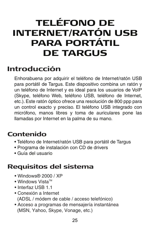 DE TARGUS Introducción Enhorabuena por adquirir el teléfono de Internet/ratón USB para portátil de Targus. Este dispositivo combina un ratón y un teléfono de Internet y es ideal para los usuarios de VoIP (Skype, teléfono Web, teléfono USB, teléfono de Internet, etc.). Este ratón óptico ofrece una resolución de 800 ppp para un control exacto y preciso. El teléfono USB integrado con micrófono, manos libres y toma de auriculares pone las llamadas por Internet en la palma de su mano. Contenido