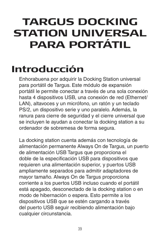 Encuentra gratis el manual del aparato UNIVERSAL LAPTOP DOCKING STATION TARGUS en formato PDF.