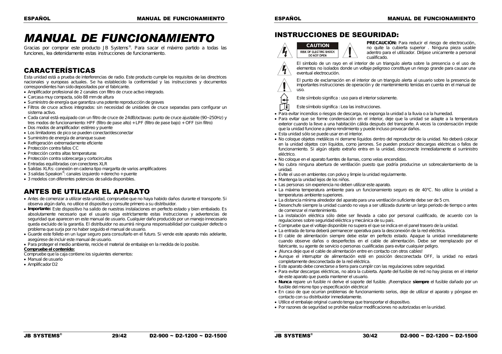 Antes de comenzar a utilizar esta unidad, compruebe que no haya habido daños durante el transporte. Si observa algún daño, no utilice el dispositivo y consulte primero a su distribuidor. Importante: Este dispositivo ha salido de nuestras instalaciones en perfecto estado y bien embalado. Es absolutamente necesario que el usuario siga estrictamente estas instrucciones y advertencias de seguridad que aparecen en este manual de usuario. Cualquier daño producido por un manejo innecesario queda excluido de la garantía. El distribuidor no asumirá ninguna responsabilidad por cualquier defecto o problema que surja por no haber seguido el manual de usuario. Guarde este folleto en un lugar seguro para consultarlo en el futuro. Si vende este aparato más adelante, asegúrese de incluir este manual de usuario. Para proteger el medio ambiente, recicle el material de embalaje en la medida de lo posible. Compruebe el contenido: Compruebe que la caja contiene los siguientes elementos: Manual de usuario Amplificador D2 JB SYSTEMS® 29/42 D2-900 ~ D2-1200 ~ D2-1500 PRECAUCIÓN: Para reducir el riesgo de electrocución, no quite la cubierta superior . Ninguna pieza usable adentro para el utilizador. Dirijase unicamente a personal cualificado. El simbolo de un rayo en el interior de un triangulo alerta sobre la presencia o el uso de elementos no isolados donde un voltaje peligroso constituye un riesgo grande para causar una eventual electrocución. CAUTION El punto de exclamación en el interior de un triangulo alerta al usuario sobre la presencia de importantes instrucciones de operación y de mantenimiento tenidas en cuenta en el manual de uso. Este símbolo significa : uso para el interior solamente. Este símbolo significa : Lea las instrucciones. Para evitar incendios o riesgos de descarga, no exponga la unidad a la lluvia o a la humedad. Para evitar que se forme condensación en el interior, deje que la unidad se adapte a la temperatura exterior cuando la lleve a una habitación cálida después del transporte. A veces la condensación impide que la unidad funcione a pleno rendimiento y puede incluso provocar daños. Esta unidad sólo se puede usar en el interior. No coloque objetos metálicos ni derrame líquidos dentro del reproductor de la unidad. No deberá colocar en la unidad objetos con líquidos, como jarrones. Se pueden producir descargas eléctricas o fallos de funcionamiento. Si algún objeto extraño entra en la unidad, desconecte inmediatamente el suministro eléctrico. No coloque en el aparato fuentes de llamas, como velas encendidas. No cubra ninguna abertura de ventilación puesto que podría producirse un sobrecalentamiento de la unidad. Evite el uso en ambientes con polvo y limpie la unidad regularmente. Mantenga la unidad lejos de los niños. Las personas sin experiencia no deben utilizar este aparato. La máxima temperatura ambiente para un funcionamiento seguro es de 40°C. No utilice la unidad a temperaturas ambiente superiores. La distancia mínima alrededor del aparato para una ventilación suficiente debe ser de 5 cm. Desenchufe siempre la unidad cuando no vaya a ser utilizada durante un largo periodo de tiempo o antes de comenzar el mantenimiento. La instalación eléctrica sólo debe ser llevada a cabo por personal cualificado, de acuerdo con la regulaciones sobre seguridad eléctrica y mecánica de su país. Compruebe que el voltaje disponible no supera el que se indica en el panel trasero de la unidad. La entrada de toma deberá permanecer operativa para la desconexión de la red eléctrica. El cable de alimentación siempre debe estar en perfecto estado. Apague la unidad inmediatamente cuando observe daños o desperfectos en el cable de alimentación. Debe ser reemplazado por el fabricante, su agente de servicio o personas cualificadas para evitar cualquier peligro. ¡Nunca deje que el cable de alimentación entre en contacto con otros cables! Aunque el interruptor de alimentación esté en posición desconectada OFF, la unidad no estará completamente desconectada de la red eléctrica. Este aparato debe conectarse a tierra para cumplir con las regulaciones sobre seguridad. Para evitar descargas eléctricas, no abra la cubierta. Aparte del fusible de red no hay piezas en el interior de este aparato que pueda mantener el usuario. Nunca repare un fusible ni derive el soporte del fusible. ¡Reemplace siempre el fusible dañado por un fusible del mismo tipo y especificación eléctrica! En caso de que ocurran problemas de funcionamiento serios, deje de utilizar el aparato y póngase en contacto con su distribuidor inmediatamente. Utilice el embalaje original cuando tenga que transportar el dispositivo. Por razones de seguridad se prohibe realizar modificaciones no autorizadas en la unidad. JB SYSTEMS® 30/42 D2-900 ~ D2-1200 ~ D2-1500 ESPAÑOL