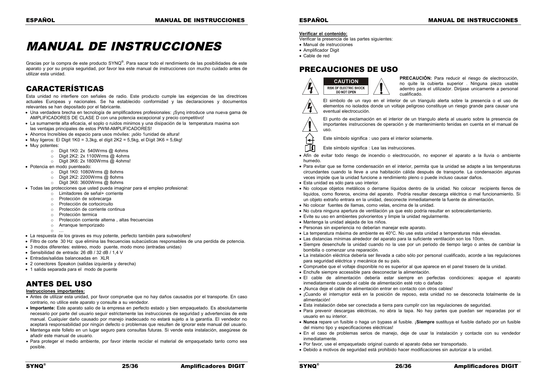 PRECAUCIÓN: Para reducir el riesgo de electrocución, no quite la cubierta superior . Ninguna pieza usable adentro para el utilizador. Dirijase unicamente a personal cualificado. El simbolo de un rayo en el interior de un triangulo alerta sobre la presencia o el uso de elementos no isolados donde un voltaje peligroso constituye un riesgo grande para causar una eventual electrocución. CAUTION CARACTERÍSTICAS Esta unidad no interfiere con señales de radio. Este producto cumple las exigencias de las directrices actuales Europeas y nacionales. Se ha establecido conformidad y las declaraciones y documentos relevantes se han depositado por el fabricante. Una verdadera brecha en tecnología de amplificadores profesionales: ¡Synq introduce una nueva gama de AMPLIFICADORES DE CLASE D con una potencia excepcional y precio competitivo! La sumamente alta eficacia, el soplo o ruidos minimos y una disipación de la temperatura maxima son las ventajas principales de estos PWM-AMPLIFICADORES! Ahorros Increíbles de espacio para usos móviles: ¡sólo 1unidad de altura! Muy ligeros: El Digit 1K0 = 3,3kg, el dígit 2K2 = 5,5kg, el Dígit 3K6 = 5,6kg! Muy potentes: o Digit 1K0: 2x 540Wrms @ 4ohms o Digit 2K2: 2x 1100Wrms @ 4ohms o Digit 3K6: 2x 1800Wrms @ 4ohms! Potencia en modo puenteado: o Digit 1K0: 1080Wrms @ 8ohms o Digit 2K2: 2200Wrms @ 8ohms o Digit 3K6: 3600Wrms @ 8ohms Todas las protecciones que usted pueda imaginar para el empleo profesional: o Limitadores de señal+ corriente o Protección de sobrecarga o Protección de cortocircuito o Protección de corriente continua o Protección termica o Protección corriente alterna , altas frecuencias o Arranque temporizado o … La respuesta de los graves es muy potente, perfecto también para subwoofers! Filtro de corte 30 Hz que elimina las frecuencias subacústicas responsables de una perdida de potencia. 3 modos diferentes: estéreo, modo puente, modo mono (entradas unidas) Sensibilidad de entrada: 26 dB / 32 dB / 1,4 V Entradas/salidas balanceadas en XLR 2 conectores Speakon (salidas izquierda y derecha) 1 salida separada para el modo de puente