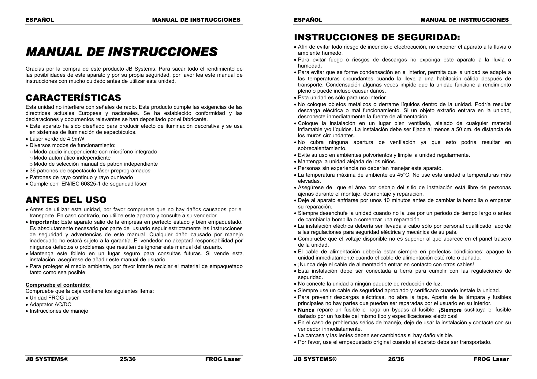 - Por favor, use el empaquetado original cuando el aparato deba ser transportado. JB SYSTEMS® 26/36 FROG Laser ESPAÑOL
