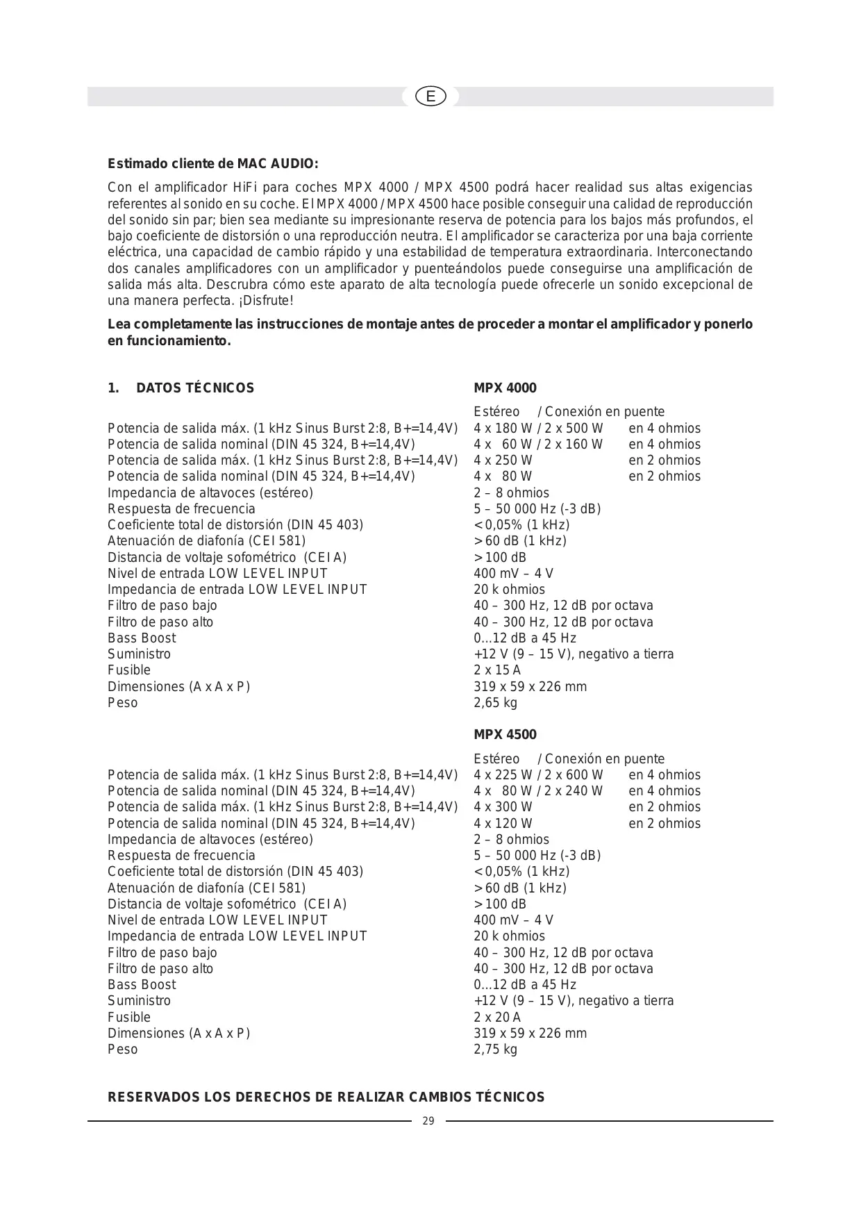 Estimado cliente de MAC AUDIO: Con el amplificador HiFi para coches MPX 4000 / MPX 4500 podrá hacer realidad sus altas exigencias referentes al sonido en su coche. El MPX 4000 / MPX 4500 hace posible conseguir una calidad de reproducción del sonido sin par; bien sea mediante su impresionante reserva de potencia para los bajos más profundos, el bajo coeficiente de distorsión o una reproducción neutra. El amplificador se caracteriza por una baja corriente eléctrica, una capacidad de cambio rápido y una estabilidad de temperatura extraordinaria. Interconectando dos canales amplificadores con un amplificador y puenteándolos puede conseguirse una amplificación de salida más alta. Descrubra cómo este aparato de alta tecnología puede ofrecerle un sonido excepcional de una manera perfecta. ¡Disfrute! Lea completamente las instrucciones de montaje antes de proceder a montar el amplificador y ponerlo en funcionamiento.