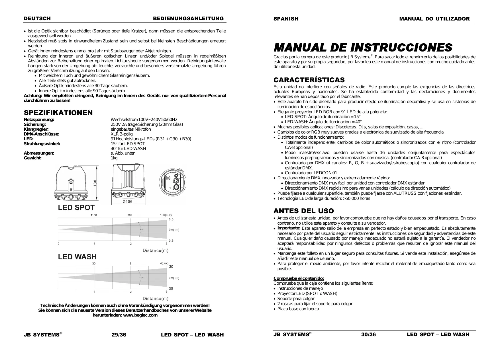 Gracias por la compra de este producto | B Systems”. Para sacar todo el rendimiento de las posibilidades de este aparato y por su propia seguridad, por favor lea este manual de instrucciones con mucho cuidado antes de utlizar esta unidad. CARACTERISTICAS Esta unidad no interfiere con señales de radio. Este producto cumple las exigencias de las directices actuales Europeas y nacionales. Se ha establecido confomidad y las declaraciones y documentos relevantes se han depositado por el fabricante + Este aparato ha sido diseñado para producir efecto de iluminacién decorativa y se usa en sistemas de iluminaciôn de espectéculos. + Elegante proyector LED RGB con 91 LED de alta potencia: ngulo de iluminaciôn =15° Angulo de iluminaciôn = 40° + Muchas posibles aplicaciones: Discotecas, DJ s, salas de exposiciôn, casas, … + Cambios de color RGB muy suaves gracias a electrônica de suavizado de alta frecuencia + Distintos modos de funcionamiento: + Totalmente independiente: cambios de color autométicos o sincronizados con el ritmo (controlador CA-8 opcional) + Modo maestroesclavo: pueden usarse hasta 16 unidades conjuntamente para espectéculos luminosos preprogramados y sincronizados con müsica. (controlador CA-8 opcional) + Controlado por DMX (4 canales: R, G, B + suavizador/estroboscopio) con cualquier controlador de estndar DMX. + Controlado por LEDCON 01 + Direccionamiento DMX innovador y extremadamente répido: + Direccionamiento DMX muy facil por unidad con controlador DMX eständar + Direcciénamiento DMX rapidisimo para varias unidades (clculo de direcciôn automético) + Puede fjarse a cualquier superficie, también puede fiarse con ALUTRUSS con fjaciones eständar. + Tecnologia LED de larga duraciôn: >50.000 horas