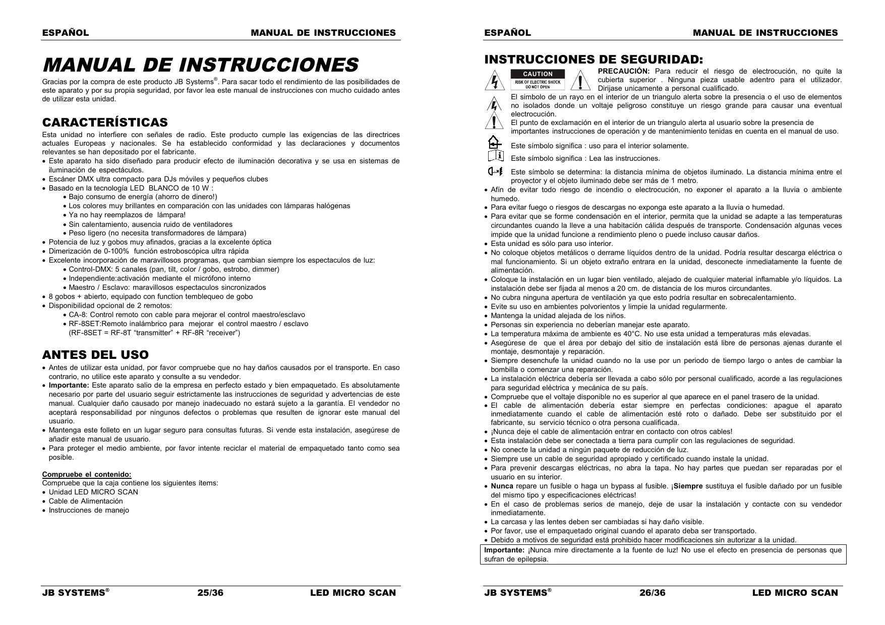 Gracias por la compra de este producto JB Systems . Para sacar todo el rendimiento de las posibilidades de este aparato y por su propia seguridad, por favor lea este manual de instrucciones con mucho cuidado antes de utilizar esta unidad. CARACTERÍSTICAS Esta unidad no interfiere con señales de radio. Este producto cumple las exigencias de las directrices actuales Europeas y nacionales. Se ha establecido conformidad y las declaraciones y documentos relevantes se han depositado por el fabricante. Este aparato ha sido diseñado para producir efecto de iluminación decorativa y se usa en sistemas de iluminación de espectáculos. Escáner DMX ultra compacto para DJs móviles y pequeños clubes Basado en la tecnología LED BLANCO de 10 W : Bajo consumo de energía (ahorro de dinero!) Los colores muy brillantes en comparación con las unidades con lámparas halógenas Ya no hay reemplazos de lámpara! Sin calentamiento, ausencia ruido de ventiladores Peso ligero (no necesita transformadores de lámpara) Potencia de luz y gobos muy afinados, gracias a la excelente óptica Dimerización de 0-100% función estroboscópica ultra rápida Excelente incorporación de maravillosos programas, que cambian siempre los espectaculos de luz: Control-DMX: 5 canales (pan, tilt, color / gobo, estrobo, dimmer) Independiente:activación mediante el micrófono interno Maestro / Esclavo: maravillosos espectaculos sincronizados 8 gobos + abierto, equipado con function temblequeo de gobo Disponibilidad opcional de 2 remotos: CA-8: Control remoto con cable para mejorar el control maestro/esclavo RF-8SET:Remoto inalámbrico para mejorar el control maestro / esclavo (RF-8SET = RF-8T “transmitter” + RF-8R “receiver”)