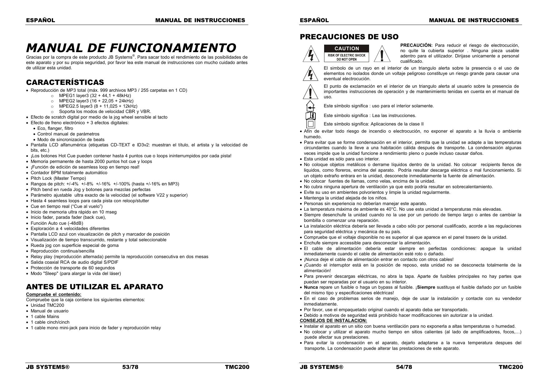 PRECAUCIÓN: Para reducir el riesgo de electrocución, no quite la cubierta superior . Ninguna pieza usable adentro para el utilizador. Dirijase unicamente a personal cualificado. El simbolo de un rayo en el interior de un triangulo alerta sobre la presencia o el uso de elementos no isolados donde un voltaje peligroso constituye un riesgo grande para causar una eventual electrocución. CAUTION El punto de exclamación en el interior de un triangulo alerta al usuario sobre la presencia de importantes instrucciones de operación y de mantenimiento tenidas en cuenta en el manual de uso. Este símbolo significa : uso para el interior solamente. Este símbolo significa : Lea las instrucciones. Este símbolo significa: Aplicaciones de la clase II Afín de evitar todo riesgo de incendio o electrocución, no exponer el aparato a la lluvia o ambiente humedo. Para evitar que se forme condensación en el interior, permita que la unidad se adapte a las temperaturas circundantes cuando la lleve a una habitación cálida después de transporte. La condensación algunas veces impide que la unidad funcione a rendimiento pleno o puede incluso causar daños. Esta unidad es sólo para uso interior. No coloque objetos metálicos o derrame líquidos dentro de la unidad. No colocar recipients llenos de liquidos, como floreros, encima del aparato. Podría resultar descarga eléctrica o mal funcionamiento. Si un objeto extraño entrara en la unidad, desconecte inmediatamente la fuente de alimentación. No colocar fuentes de llamas, como velas, encima de la unidad. No cubra ninguna apertura de ventilación ya que esto podría resultar en sobrecalentamiento. Evite su uso en ambientes polvorientos y limpie la unidad regularmente. Mantenga la unidad alejada de los niños. Personas sin experiencia no deberían manejar este aparato. La temperatura máxima de ambiente es 40°C. No use esta unidad a temperaturas más elevadas. Siempre desenchufe la unidad cuando no la use por un periodo de tiempo largo o antes de cambiar la bombilla o comenzar una reparación. La instalación eléctrica debería ser llevada a cabo sólo por personal cualificado, acorde a las regulaciones para seguridad eléctrica y mecánica de su país. Compruebe que el voltaje disponible no es superior al que aparece en el panel trasero de la unidad. Enchufe siempre accessible para desconectar la alimentación. El cable de alimentación debería estar siempre en perfectas condiciones: apague la unidad inmediatamente cuando el cable de alimentación esté roto o dañado. ¡Nunca deje el cable de alimentación entrar en contacto con otros cables! ¡Cuando el interruptor está en la posición de reposo, esta unidad no se desconecta totalmente de la alimentación! Para prevenir descargas eléctricas, no abra la tapa. Aparte de fusibles principales no hay partes que puedan ser reparadas por el usuario en su interior. Nunca repare un fusible o haga un bypass al fusible. ¡Siempre sustituya el fusible dañado por un fusible del mismo tipo y especificaciones eléctricas! En el caso de problemas serios de manejo, deje de usar la instalación y contacte con su vendedor inmediatamente. Por favor, use el empaquetado original cuando el aparato deba ser transportado. Debido a motivos de seguridad está prohibido hacer modificaciones sin autorizar a la unidad. CONSEJOS DE INSTALACION: Instalar el aparato en un sitio con buena ventilación para no exponerla a altas temperaturas o humedad. No colocar y utilizar el aparato mucho tiempo en sitios calientes (al lado de amplificadores, focos,…) puede afectar sus prestaciones. Para evitar la condensación en el aparato, dejarlo adaptarse a la nueva temperatura despues del transporte. La condensación puede alterar las prestaciones de este aparato. JB SYSTEMS® 54/78 TMC200 ESPAÑOL