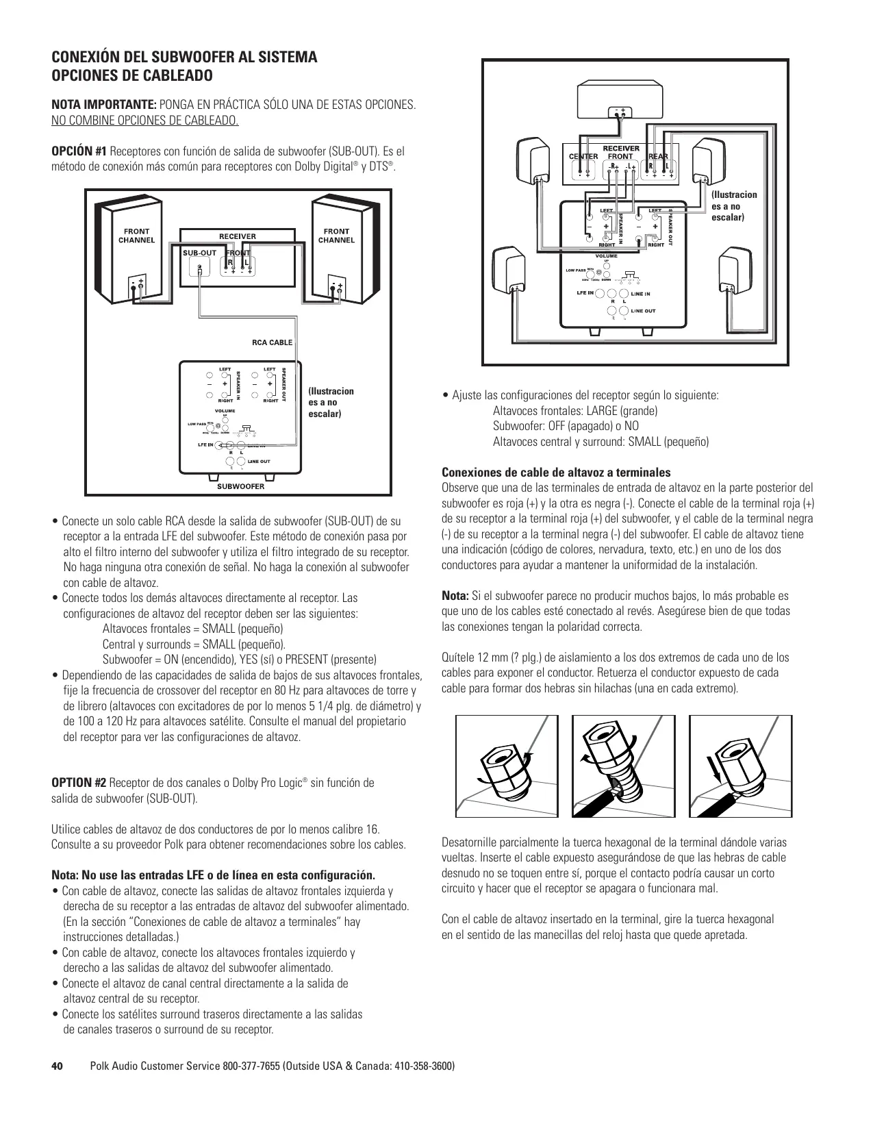 Si tiene problemas afterwards de seguir estas instrucciones de cableado, revise bien todas las conexiones de cables. Si determina que el problema está en el subwoofer,pongase en contacto con el proveedor autorizzato de Polk Audio donde hace su compra o comuniquese con el Departamento de Atencion al Cliente de Polk Audio Ilamando al 1-800-377-7655 (sólo llamadas bajo de EE.UU. o Canada). Fuera de EE.UU. y Canada, Ilame al 410-358-3600 de lunes a viernes, de 9 a.m. a 6 p.m., hora del Este.