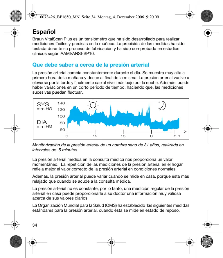 6073426_BP1650_MN Seite 34 Montag, 4. Dezember 2006 9:20 09 Español Braun VitalScan Plus es un tensiómetro que ha sido desarrollado para realizar mediciones fáciles y precisas en la muñeca. La precisión de las medidas ha sido testada durante su proceso de fabricación y ha sido comprobada en estudios clínicos según AAMI/ANSI-SP10. Que debe saber a cerca de la presión arterial La presión arterial cambia constantemente durante el día. Se muestra muy alta a primera hora de la mañana y decae al final de la misma. La presión arterial vuelve a elevarse por la tarde y finalmente cae al nivel más bajo por la noche. Además, puede haber variaciones en un corto período de tiempo, haciendo que, las mediciones sucesivas puedan fluctuar. SYS