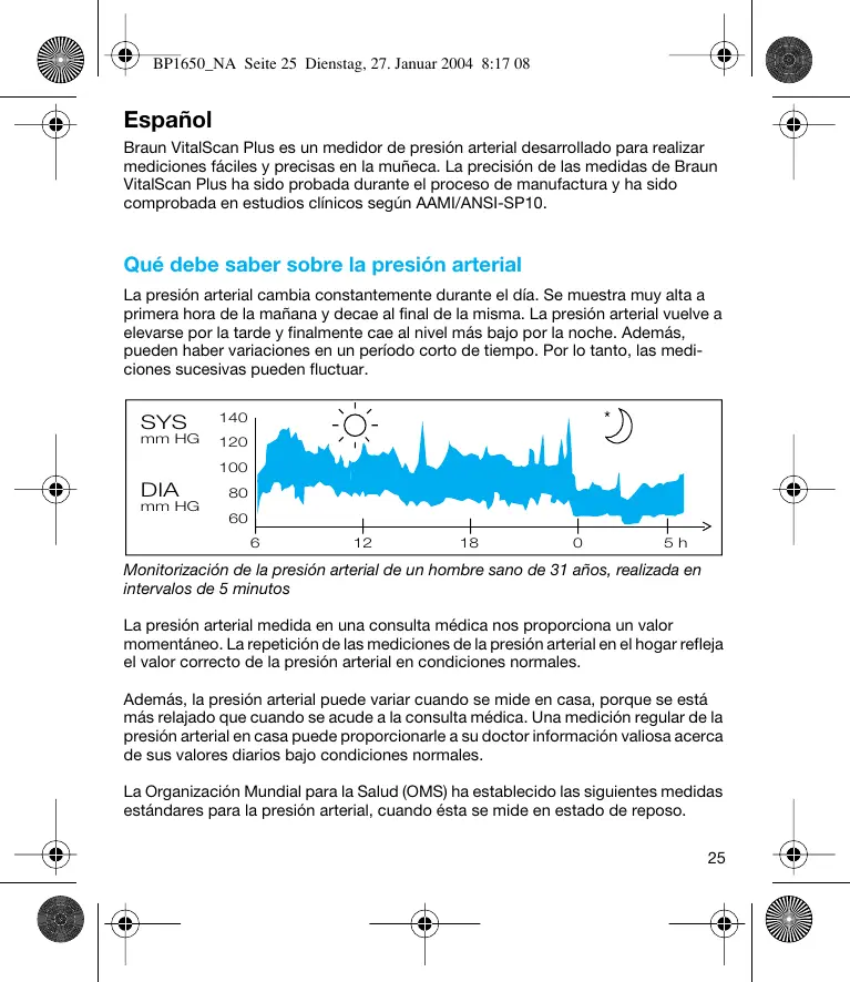 Gracias por comprar un producto Braun. Esperamos que se encuentre completamente satisfecho con su nuevo VitalScan Plus. Si Ud. tiene preguntas, por favor en EEUU llame al: 1-888-848-2572 Internet: www.braun.com Español Braun VitalScan Plus es un medidor de presión arterial desarrollado para realizar mediciones fáciles y precisas en la muñeca. La precisión de las medidas de Braun VitalScan Plus ha sido probada durante el proceso de manufactura y ha sido comprobada en estudios clínicos según AAMI/ANSI-SP10. Qué debe saber sobre la presión arterial La presión arterial cambia constantemente durante el día. Se muestra muy alta a primera hora de la mañana y decae al final de la misma. La presión arterial vuelve a elevarse por la tarde y finalmente cae al nivel más bajo por la noche. Además, pueden haber variaciones en un período corto de tiempo. Por lo tanto, las mediciones sucesivas pueden fluctuar. SYS