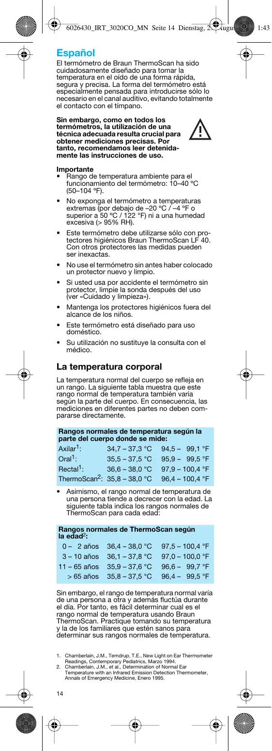 Español El termómetro de Braun ThermoScan ha sido cuidadosamente diseñado para tomar la temperatura en el oído de una forma rápida, segura y precisa. La forma del termómetro está especialmente pensada para introducirse sólo lo necesario en el canal auditivo, evitando totalmente el contacto con el tímpano. Sin embargo, como en todos los termómetros, la utilización de una técnica adecuada resulta crucial para obtener mediciones precisas. Por tanto, recomendamos leer detenidamente las instrucciones de uso. Importante