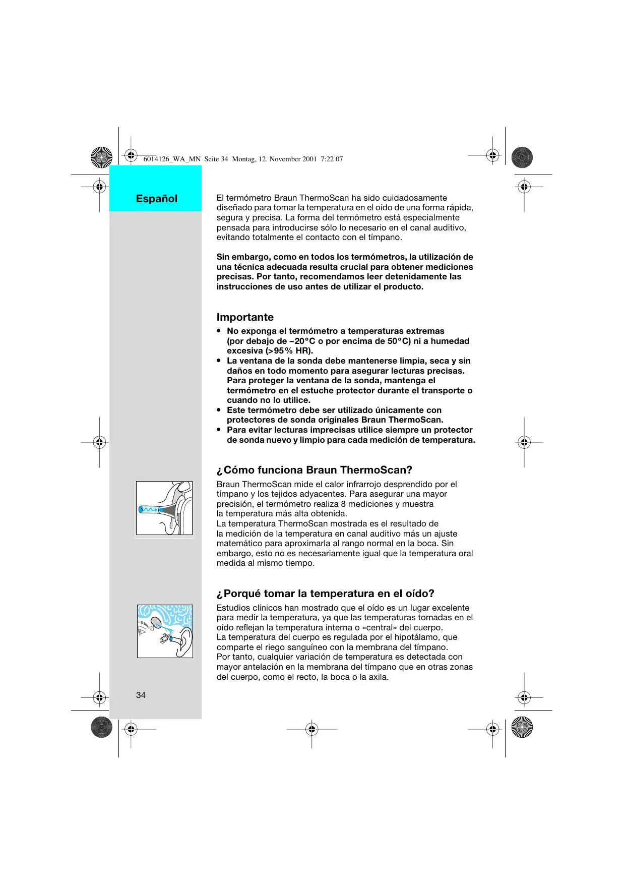 El termómetro Braun ThermoScan ha sido cuidadosamente diseñado para tomar la temperatura en el oído de una forma rápida, segura y precisa. La forma del termómetro está especialmente pensada para introducirse sólo lo necesario en el canal auditivo, evitando totalmente el contacto con el tímpano. Sin embargo, como en todos los termómetros, la utilización de una técnica adecuada resulta crucial para obtener mediciones precisas. Por tanto, recomendamos leer detenidamente las instrucciones de uso antes de utilizar el producto. Importante