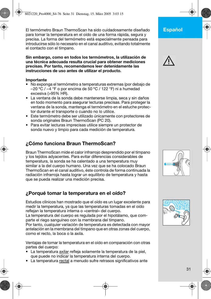 El termómetro Braun ThermoScan ha sido cuidadosamente diseñado para tomar la temperatura en el oído de una forma rápida, segura y precisa. La forma del termómetro está especialmente pensada para introducirse sólo lo necesario en el canal auditivo, evitando totalmente el contacto con el tímpano. Español Sin embargo, como en todos los termómetros, la utilización de una técnica adecuada resulta crucial para obtener mediciones precisas. Por tanto, recomendamos leer detenidamente las instrucciones de uso antes de utilizar el producto. Importante