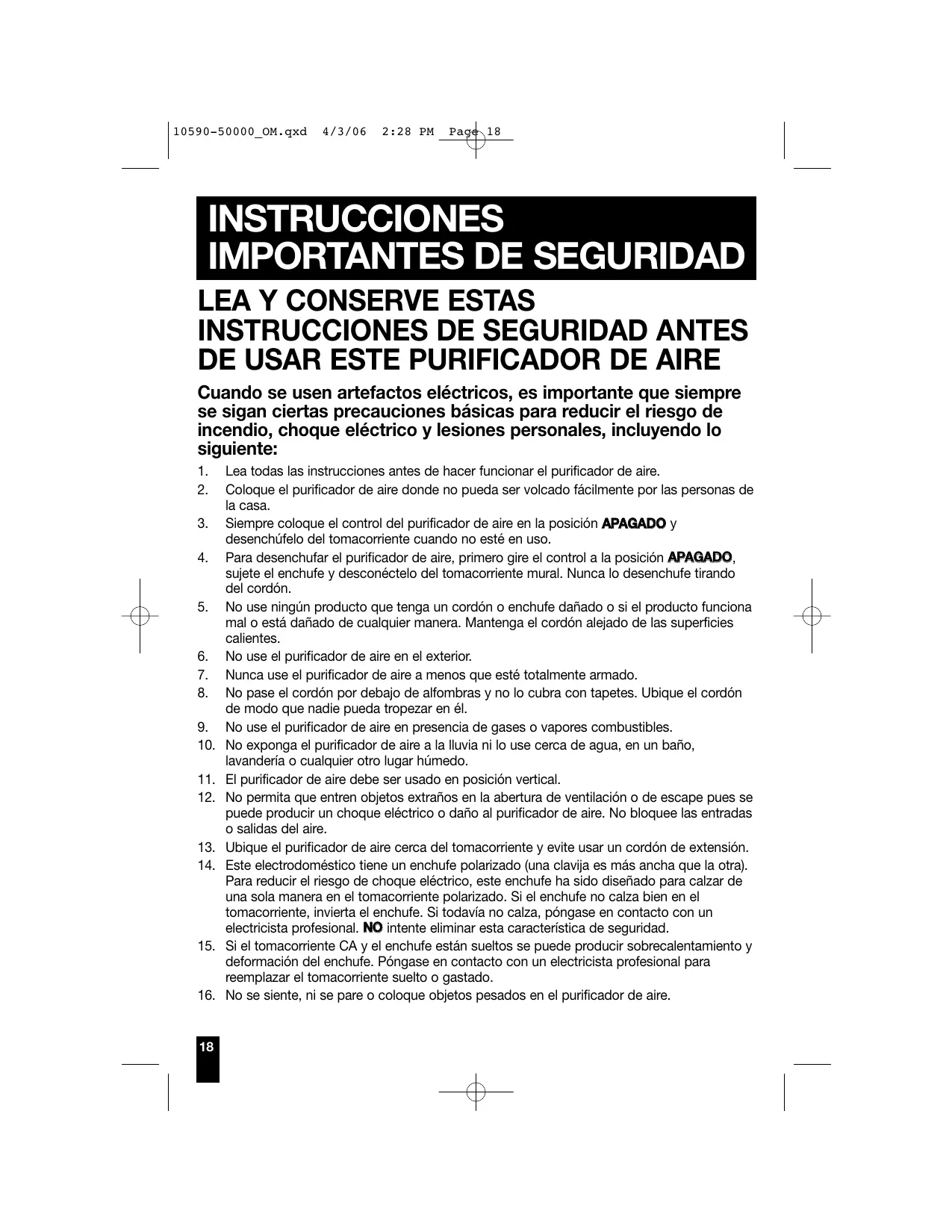 Lea todas las instrucciones antes de hacer funcionar el purificador de aire. Coloque el purificador de aire donde no pueda ser volcado fácilmente por las personas de la casa. Siempre coloque el control del purificador de aire en la posición APAGADO y desenchúfelo del tomacorriente cuando no esté en uso. Para desenchufar el purificador de aire, primero gire el control a la posición APAGADO, sujete el enchufe y desconéctelo del tomacorriente mural. Nunca lo desenchufe tirando del cordón. No use ningún producto que tenga un cordón o enchufe dañado o si el producto funciona mal o está dañado de cualquier manera. Mantenga el cordón alejado de las superficies calientes. No use el purificador de aire en el exterior. Nunca use el purificador de aire a menos que esté totalmente armado. No pase el cordón por debajo de alfombras y no lo cubra con tapetes. Ubique el cordón de modo que nadie pueda tropezar en él. No use el purificador de aire en presencia de gases o vapores combustibles. No exponga el purificador de aire a la lluvia ni lo use cerca de agua, en un baño, lavandería o cualquier otro lugar húmedo. El purificador de aire debe ser usado en posición vertical. No permita que entren objetos extraños en la abertura de ventilación o de escape pues se puede producir un choque eléctrico o daño al purificador de aire. No bloquee las entradas o salidas del aire. Ubique el purificador de aire cerca del tomacorriente y evite usar un cordón de extensión. Este electrodoméstico tiene un enchufe polarizado (una clavija es más ancha que la otra). Para reducir el riesgo de choque eléctrico, este enchufe ha sido diseñado para calzar de una sola manera en el tomacorriente polarizado. Si el enchufe no calza bien en el tomacorriente, invierta el enchufe. Si todavía no calza, póngase en contacto con un electricista profesional. NO intente eliminar esta característica de seguridad. Si el tomacorriente CA y el enchufe están sueltos se puede producir sobrecalentamiento y deformación del enchufe. Póngase en contacto con un electricista profesional para reemplazar el tomacorriente suelto o gastado. No se siente, ni se pare o coloque objetos pesados en el purificador de aire. 10590-50000_OM.qxd 4/3/06 2:28 PM Page 19