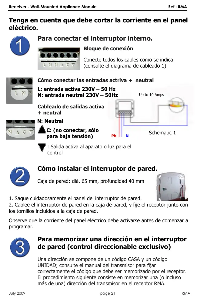 - El receptor RMA responde arialquier orden RF recibida de qualiaier transmisor, y la convierte a ordenes X10 por la linea de corriente.