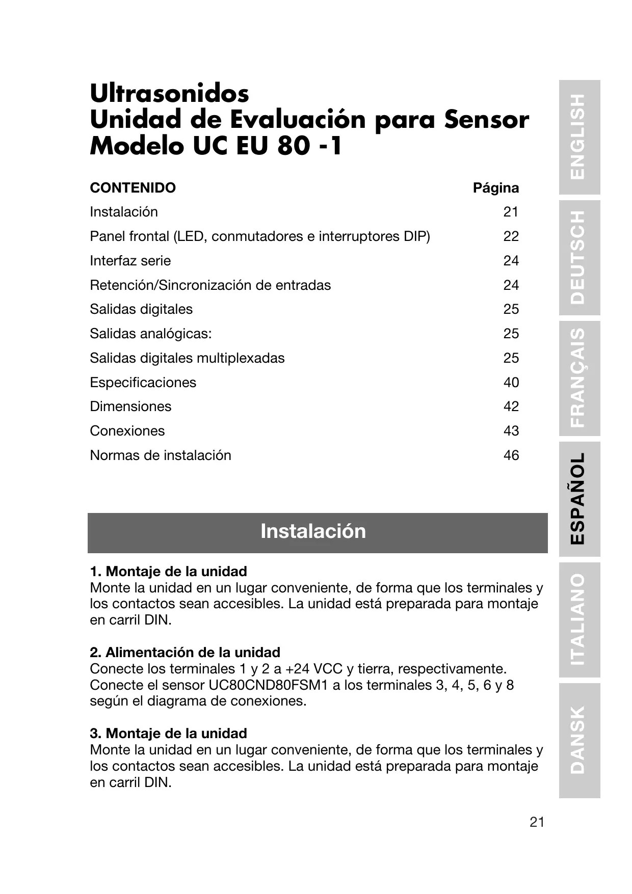 ITALIANO Instalación DEUTSCH Página DANSK CONTENIDO ENGLISH Ultrasonidos Unidad de Evaluación para Sensor Modelo UC EU 80 -1 ENGLISH Panel frontal En este capítulo se describen brevemente los conmutadores, interruptores DIP y los LED situados en el panel frontal. ITALIANO DANSK F 0 12