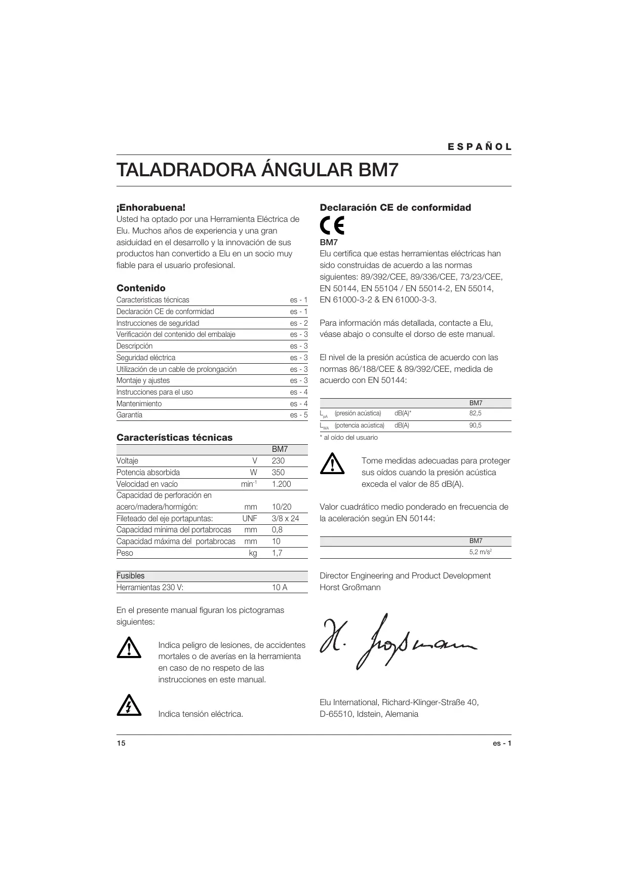 Il livello di rumorosità è conforme alle norme 86/188/CEE e 89/392/CEE, dati ricavati in base alla norma EN 50144: BM7 EN 61000-3-3. Neem voor meer informatie contact op met Elu, zie het adres hieronder of op de achterkant van deze handleiding. Niveau van de geluidsdruk overeenkomstig 86/188/EEG & 89/392/EEG, gemeten volgens EN 50144: BM7