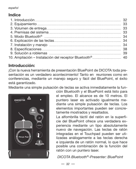 Si tvuiera Ud. bajo problema con el manejo del BluePoint,pongase entonces en contacto con su commerciente o distribuidor local. Por lo demas, también可以选择 contactarnos atramse de info@dicota.com.