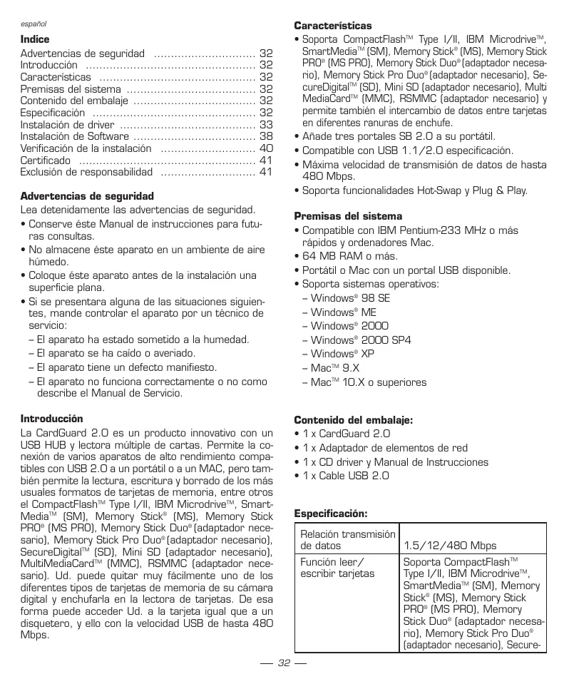 La CardGuard 2.0 es un producto innovativo con un USB HUB y lectora multiple de cartas. Permitte la connexion de various aparatos de alto rendimiento compatibles con USB 2.0 a un portátil o a un MAC, pero también permite la lecture, escritura y borrado de los más usuales formatos de tarjetas de memoria, entre otherstel CompactFlash™ Type I/II, IBM Microdrive™, SmartMedia™ (SM), Memory Stick® (MS), Memory Stick PRO® (MS PRO), Memory Stick Duo® (adaptador NEEDARIO), Memory Stick Pro Duo® (adaptador NEEDARIO), SecureDigital™ (SD), Mini SD (adaptador NEEDARIO), MultiMediaCard™ (MMC), RSMMC (adaptador NEEDARIO). Ud.puede quitar muy fácilmente uno de los differentes temas de tarjetas de memoria de su cármadigital y enchufarla en la lectora de tarjetas. De esta forma(puede acceder Ud. a la tarjeta igual que a un disquetero,yellow con la velocidad USB de hasta 480 Mbps.