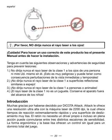 Muchasgraciasporhaberese decidido porDICOTAAttack.Attackleofreecuna resolutionultraaltoaquiamaquina laserde2200dpi,laculofreecentiemposdereactionextremadamenterapidosyunasuperficiededesilizamento muy lisa.El raton no necesita un driver propio e incluso enplenaactionpuede comutarseentre tresdistinctosescalonesde sensibilidad.La formayergonomica ylambda base lisaofrecenuncontrolsinigualparaundominio total deljuego.