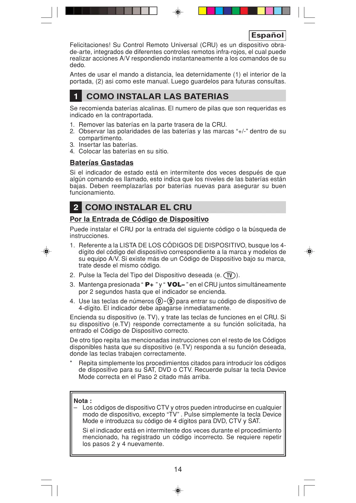 Puede instalar el CRU por la entrada del siguiente código o la búsqueda de instrucciones. 1. Referente a la LISTA DE LOS CÓDIGOS DE DISPOSITIVO, busque los 4dígito del código del dispositivo correspondiente a la marca y modelos de su equipo A/V. Si existe más de un Código de Dispositivo bajo su marca, trate desde el mismo código. 2. Pulse la Tecla del Tipo del Dispositivo deseada (e. TV ). 3. Mantenga presionada “ P+ ” y “ VOL– ” en el CRU juntos simultáneamente por 2 segundos hasta que el indicador se encienda. 4. Use las teclas de números para entrar su código de dispositivo de 4-dígito. El indicador debe apagarse inmediatamente. Encienda su dispositivo (e. TV), y trate las teclas de funciones en el CRU. Si su dispositivo (e.TV) responde correctamente a su función solicitada, ha entrado el Código de Dispositivo correcto. De otro tipo repita las mencionadas instrucciones con el resto de los Códigos disponibles hasta que su dispositivo (e.TV) responda a su función deseada, donde las teclas trabajen correctamente. * Repita simplemente los procedimientos citados para introducir los códigos de dispositivo para su SAT, DVD o CTV. Recuerde pulsar la tecla Device Mode correcta en el Paso 2 citado más arriba.