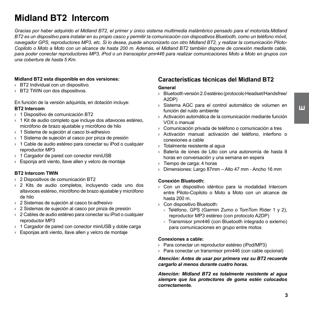 Dispositivo acceso (standby) Midland BT2 Intercom Gracias por haber adquirido el Midland BT2, el primer y único sistema multimedia inalámbrico pensado para el motorista.Midland BT2 es un dispositivo para instalar en su propio casco y permitir la comunicación con dispositivos Bluetooth, como un teléfono móvil, navegador GPS, reproductores MP3, etc. Si lo desea, puede sincronizarlo con otro Midland BT2, y realizar la comunicación PilotoCopiloto o Moto a Moto con un alcance de hasta 200 m. Además, el Midland BT2 también dispone de conexión mediante cable, para poder conectar reproductores MP3, iPod o un transceptor pmr446 para realizar comunicaciones Moto a Moto en grupos con una cobertura de hasta 5 Km. En función de la versión adquirida, en dotación incluye: BT2 Intercom ›› 1 Dispositivo de comunicación BT2 ›› 1 Kit de audio completo que incluye dos altavoces estéreo, micrófono de brazo ajustable y micrófono de hilo ›› 1 Sistema de sujeción al casco bi-adhesivo ›› 1 Sistema de sujeción al casco por pinza de presión ›› 1 Cable de audio estéreo para conectar su iPod o cualquier reproductor MP3 ›› 1 Cargador de pared con conector miniUSB ›› Esponja anti viento, llave allen y velcro de montaje BT2 Intercom TWIN ›› 2 Dispositivos de comunicación BT2 ›› 2 Kits de audio completos, incluyendo cada uno dos altavoces estéreo, micrófono de brazo ajustable y micrófono de hilo ›› 2 Sistemas de sujeción al casco bi-adhesivo ›› 2 Sistemas de sujeción al casco por pinza de presión ›› 2 Cables de audio estéreo para conectar su iPod o cualquier reproductor MP3 ›› 1 Cargador de pared con conector miniUSB y doble carga ›› Esponjas anti viento, llave allen y velcro de montaje Características técnicas del Midland BT2 General ›› Bluetooth versión 2.0 estéreo (protocolo Headset/Handsfree/ A2DP) ›› Sistema AGC para el control automático de volumen en función del ruido ambiente ›› Activación automática de la comunicación mediante función VOX o manual ›› Comunicación privada de teléfono o comunicación a tres ›› Activación manual: activación del teléfono, interfono o conexiones a cable ›› Totalmente resistente al agua ›› Batería de iones de Litio con una autonomía de hasta 8 horas en conversación y una semana en espera ›› Tiempo de carga: 4 horas ›› Dimensiones: Largo 87mm – Alto 47 mm - Ancho 16 mm Conexión Bluetooth: ›› Con un dispositivo idéntico para la modalidad Intercom entre Piloto-Copiloto o Moto a Moto con un alcance de hasta 200 m. ›› Con dispositivo Bluetooth: - Teléfono, GPS (Garmin Zumo o TomTom Rider 1 y 2), reproductor MP3 estéreo (con protocolo A2DP) - Transmisor pmr446 (con Bluetooth integrado o externo) para comunicaciones en grupo entre motos Conexiones a cable: ›› Para conectar un reproductor estéreo (iPod/MP3) ›› Para conectar un transmisor pmr446 (con cable opcional) Atención: Antes de usar por primera vez su BT2 recuerde cargarlo al menos durante cuatro horas. Atención: Midland BT2 es totalmente resistente al agua siempre que los protectores de goma estén colocados correctamente.