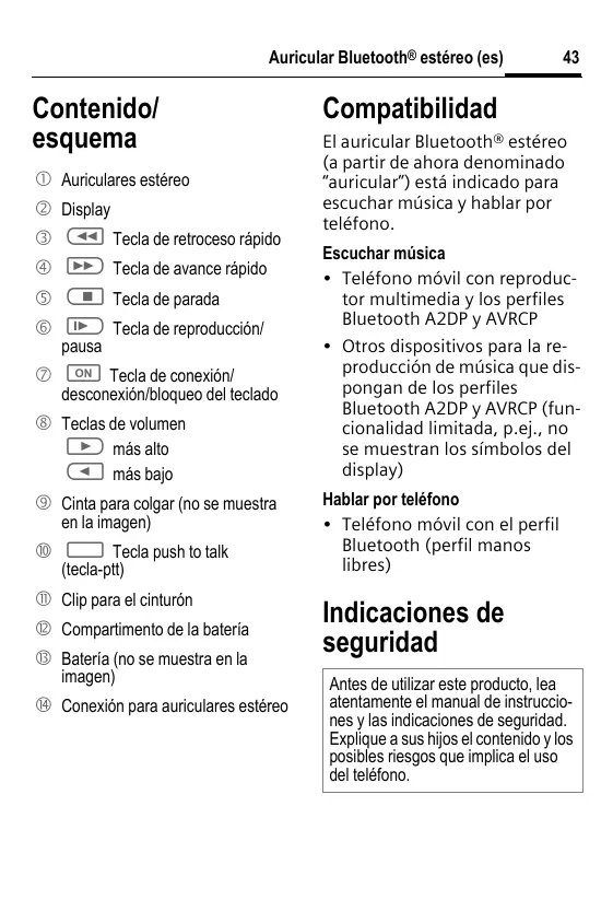 Auricular Bluetooth® estéreo (es) 4 Contenido/ esquema Auriculares estéreo Display CX) Tecla de retroceso rpido © TC») Tecla de avance räpido Cm] Tecla de parada Ü») Tecla de reproducciôn/ pausa o) Tecla de conexiôn/ desconexiôn/bloqueo del teclado ® Teclas de volumen CD més alto CC] més bajo © Cinta para colgar (no se muestra en la imagen) ® C2 Tecia push to talk (tecla-ptt) ® Clip para el cinturôn ® Compartimento de la bateria ® Bateria (no se muestra en la imagen) @ Conexiôn para auriculares estéreo Compatibilidad El auricular Bluetooth® estéreo {a partir de ahora denominado “auricular”) esté indicado para escuchar müsica y hablar por teléfono. Escuchar mûsica Teléfono mévil con reproduc- tor multimedia y los perfiles Bluetooth A2DP y AVRCP Otros dispositivos para la re- producciôn de müsica que dis- pongan de los perfiles Bluetooth A2DP y AVRCP (fun- cionalidad limitada, p.ej., no se muestran los smbolos del display) Hablar por teléfono +_ Teléfono mévil con el perfil Bluetooth (perfil manos libres) Indicaciones de seguridad Antes de utlizar este producto, lea atentamente el manual de instruccio- nes y las indicaciones de seguridad. Explique a sus hjos el contenido y los posibles riesgos que implica el uso del teléfono.