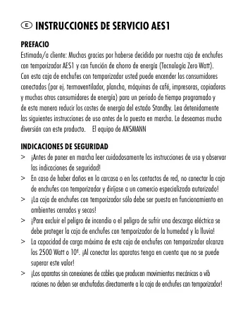 E Instrucciones de servicio AES1 PREFACIO Estimado/a cliente: Muchas gracias por haberse decidido por nuestra caja de enchufes con temporizador AES1 y con función de ahorro de energía (Tecnología Zero Watt). Con esta caja de enchufes con temporizador usted puede encender los consumidores conectados (por ej. termoventilador, plancha, máquinas de café, impresoras, copiadoras y muchos otros consumidores de energía) para un periodo de tiempo programado y de esta manera reducir los costes de energía del estado Standby. Lea detenidamente las siguientes instrucciones de uso antes de la puesta en marcha. Le deseamos mucha diversión con este producto. El equipo de ANSMANN