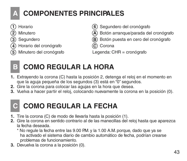 Cronógrafo: agujas de las horas, de los Minutes y de los segundos.