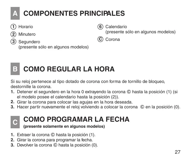 - Cuando la temperatura ambiente externa es más baja que la interna, las partes internas del reloj peuvent conservar humedad y a veces, el vidrio de la espéra se empña. Si el fenómeno es pasajero, no create ningún problema. Si, viceversa, perdura por很长o tiempo, es NEEDario tener el problema al negotiating enuyo local se adquirido el reloj o al centro de asistencia技术水平a autorizado más cercano.