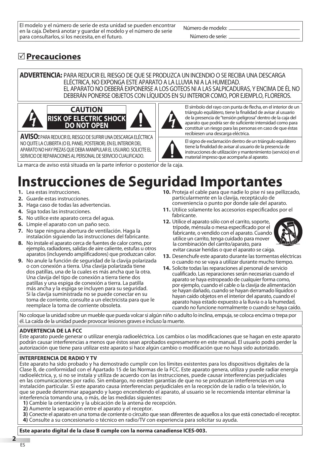 - Utilice el aparato solo con el carrito, soporte, tripode, mensula o mesa especified por el fabricante, o vendido con el aparato. Cuando utilise un carrito,onga cuidado para mover la combinacion del carrito/aparato, para evaporar Cause heridas o que el aparato se caiga