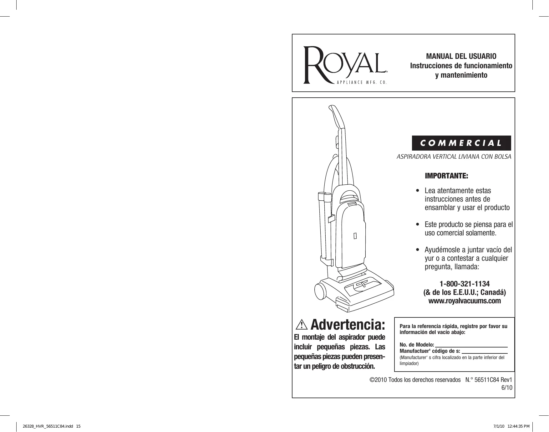 1-800-321-1134 (& de los E.E.U.U.; Canaday www.royalvacuums.com