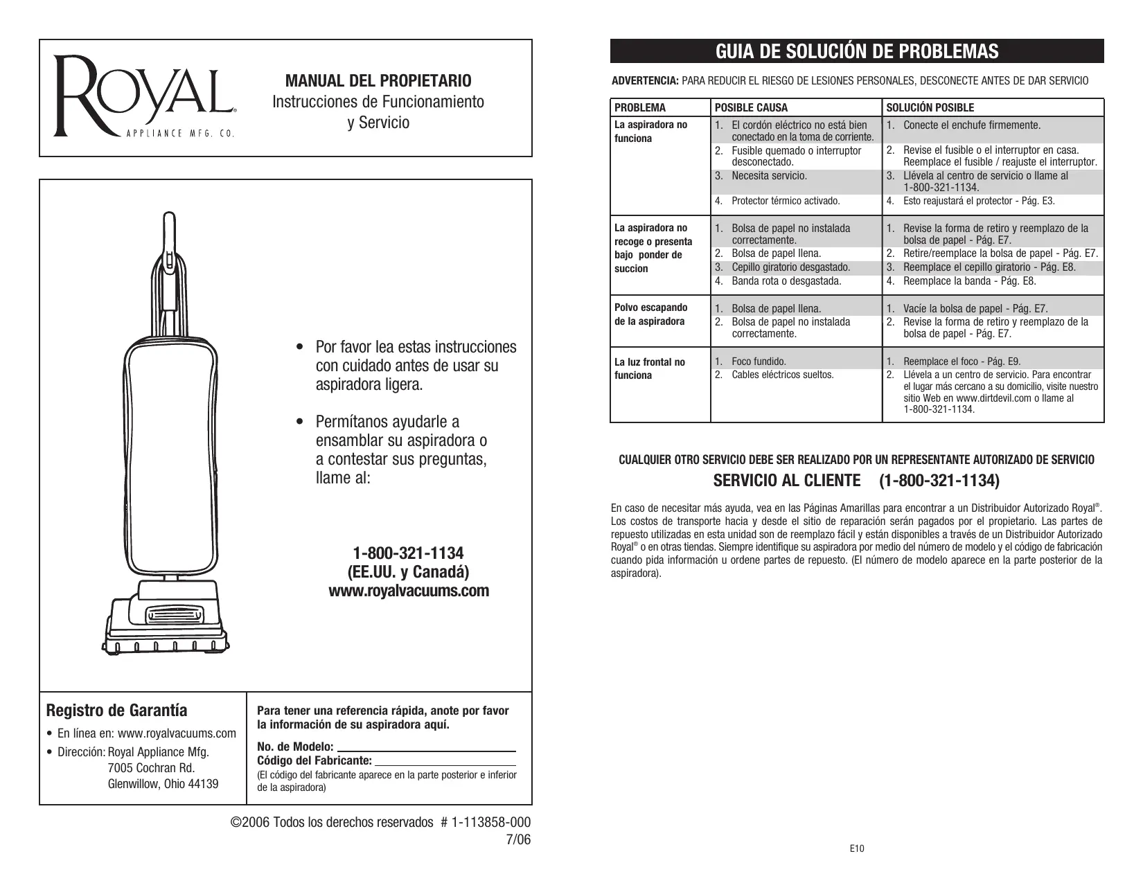 En caso que la aspiradora mestone algo ndefecto bajo el periodo de garantía, reparamos o reemplazarnos de manos gratuiterialmentefectuosa.Laquina completadebeserenviadaconportepagado acualquierEstacionAutorizadaROYAL deVentas y Servicio deGarantia.Porfavorincluyauna descripcióncompletedela problema,fecha delcompra,copia del recibo delcompraoriginalynsurname,domicilioynummero detelefon.Sin no seencuentrafelacena deunaEstaciondeGarantia,llamea lafabricapadoporiderasencia en losEE.UU.yCANAD:A:1-800-321-1134.Use solamente partedesrepuestos genuinasRoyal