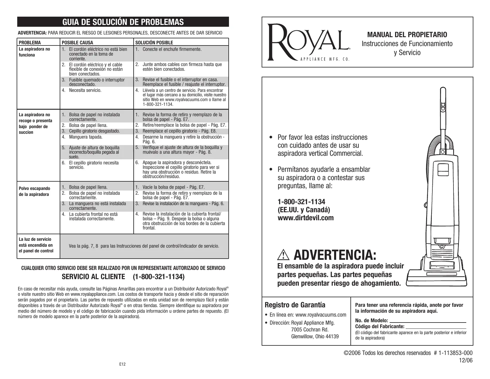 En caso que la aspiradora mueste algo ndefecto bajo el periodo de garantía, reparamos o reemplazarnos de眼看 agradable parte defectuosa. Laquina completa de ser enviada con porte pagado a su querier Estación Autorizada ROYAL de Ventas y Servicio de Garantía. Por favor incluya una descripción completa del problema, Fecha de compra, copia del recibo de compra original y su nombre, domicilio y número de téléphone. Si no se enquiry a circa de una Estación de Garantía, llama a la fabricula para pedir asistencia en los EE.UU. y CANADÁ: 1-800-321-1134. Use solamente partes de repuesto genuinas Royal.