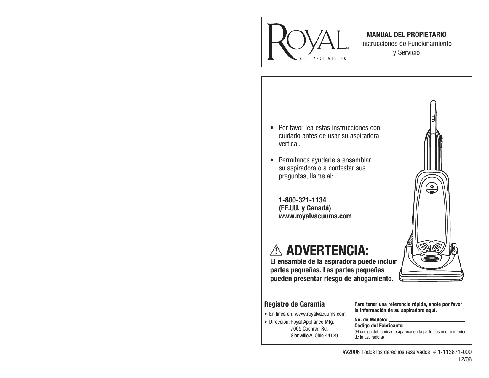 En caso que la aspiradora mueste algo ndefecto bajo el periodo de garantía, reparamos o reemplazarnos de manos gratuiterialmentefectuosa.Laquina completadebeserenviadaconportepagado acualquierEstacionAutorizadaROYAL deVentas y Servicio deGarantia.Porfavorincluyauna descripcióncompletedela problema,fecha delcompra,copia del recibo delcompraoriginalynsurname,domicilioynummero detelefon.Sin no seencuentracercaofunaEstaciondeGarantia,llamea lafabricapadoporiderasencia en losEE.UU.yCANAD:A:1-800-321-1134.Use solamente partedesrepuestos genuinasRoyal