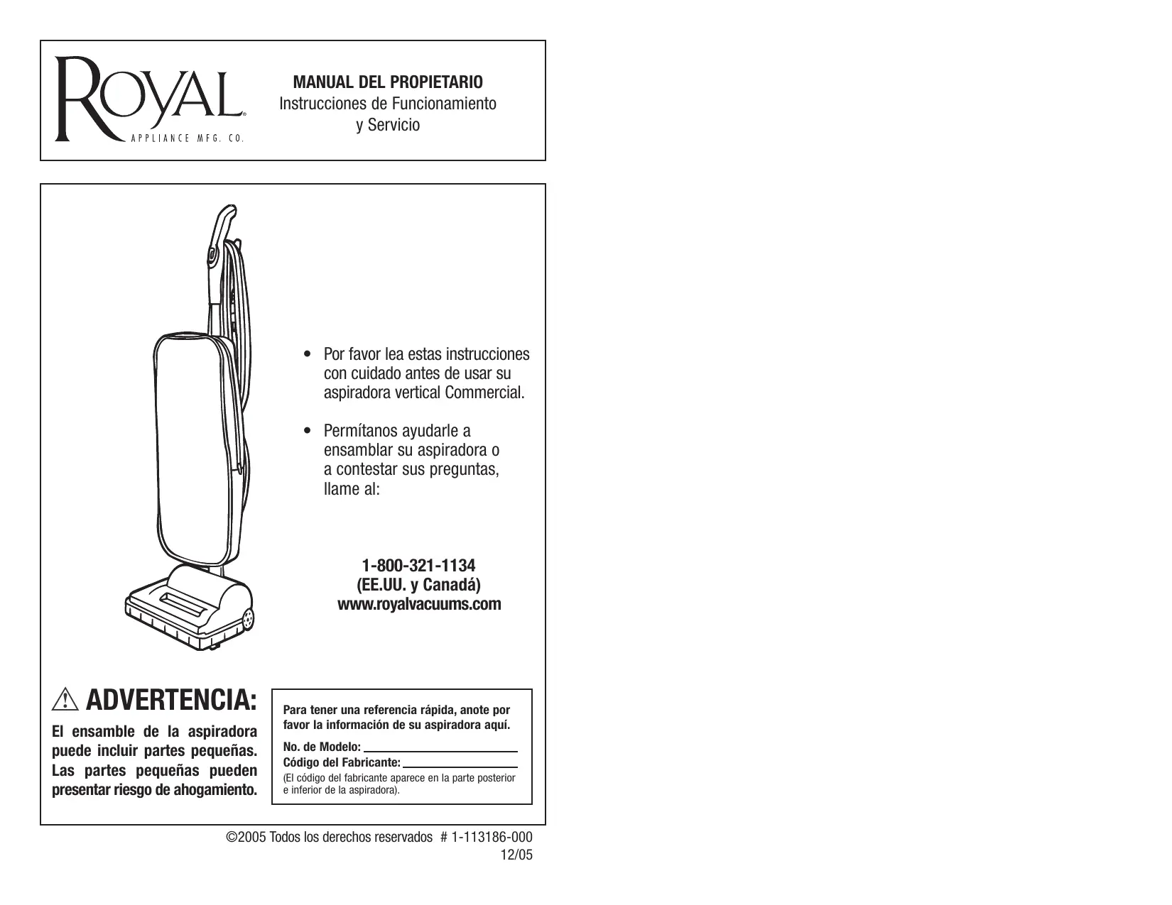 Usted es ahora el orgulioso propietario de una aspiradora vertical Commercial de Royal. Confiamos en que sunea adquisicion le ofrecerá muchos años de satisfacción.