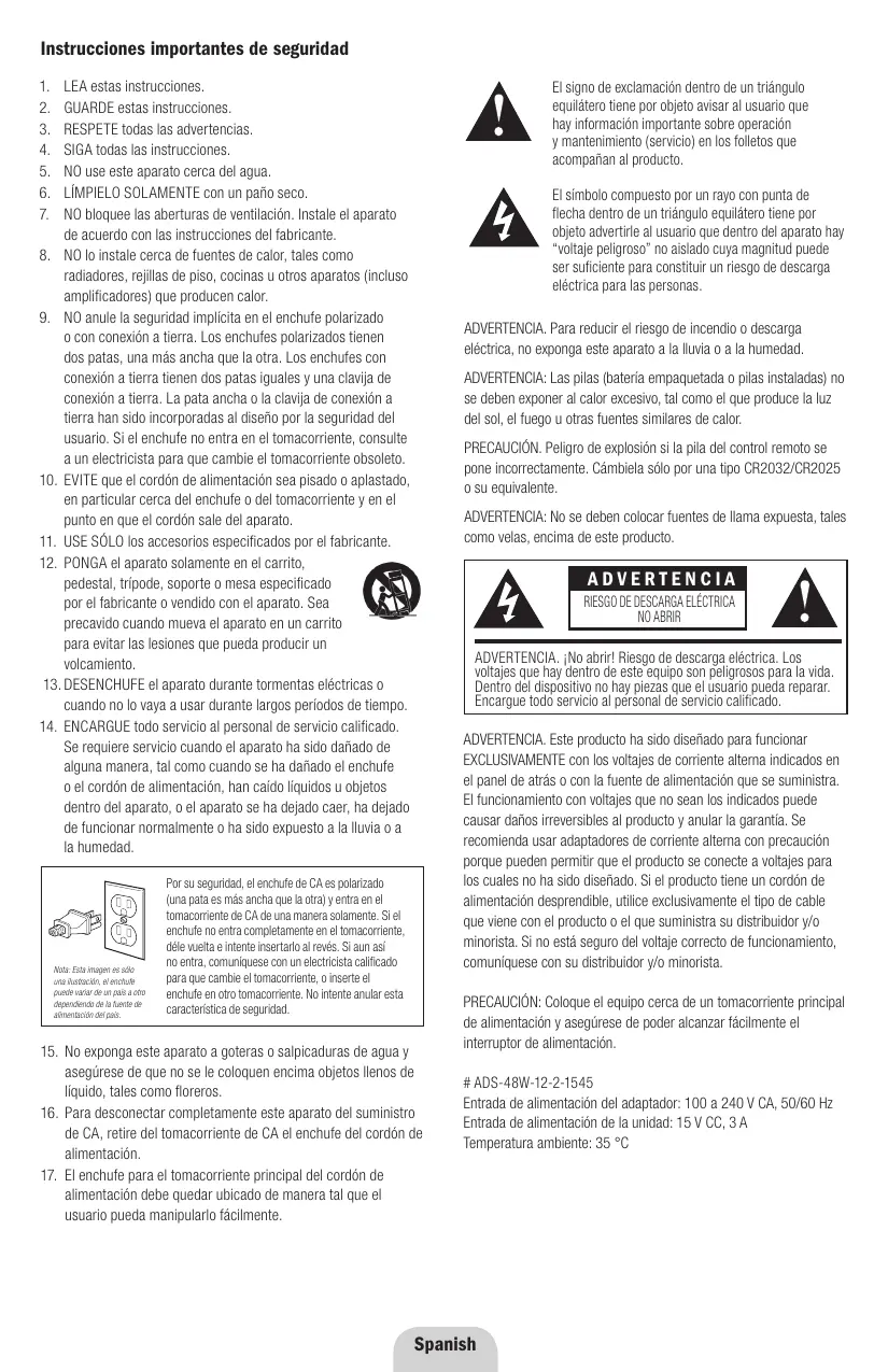 ADVERTENCIA. INoAbrir! Riesgo de descarga eletrica.Los voltajes que hay bajo de este equipo son peligosros para la vida. Dento del dispositivo no hay piezas que el usuario pueda reparar. Encargue todo serviceo al personal de serviceo calificado.