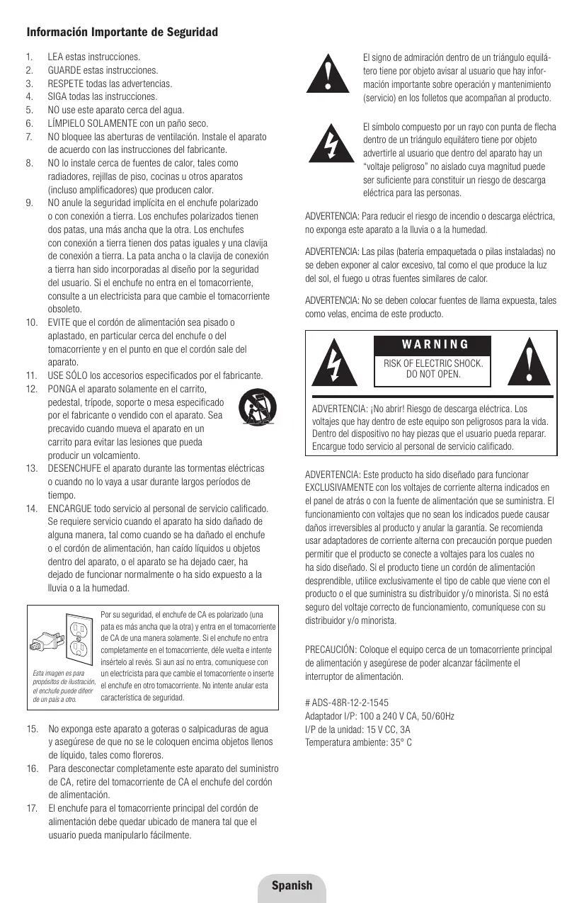 EXCLUSIVAMENTE con los voltajes de corriente alterna indicados en el panel de atrás o con la fuente de alimentación que se suministra. El funcionamiento con voltajes que no sean los indicados puede causar daños irreversibles al producto y anular la garantía. Se recomienda usar adaptadores de corriente alterna con precaución porque pueden permitir que el producto se conecte a voltajes para los cuales no ha sido diseñado. Si el producto tiene un cordón de alimentación desprendible, utilice exclusivamente el tipo de cable que viene con el producto o el que suministra su distribuidor y/o minorista. Si no está seguro del voltaje correcto de funcionamiento, comuníquese con su distribuidor y/o minorista. PRECAUCIÓN: Coloque el equipo cerca de un tomacorriente principal de alimentación y asegúrese de poder alcanzar fácilmente el interruptor de alimentación. # ADS-48R-12-2-1545 Adaptador I/P: 100 a 240 V CA, 50/60Hz
