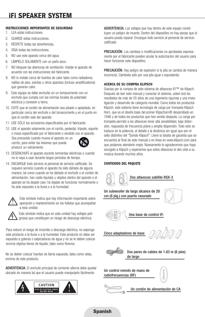 PRECAUCIÓN. Los cambios o modificaciones no aprobados expresamente por el fabricante pueden anular la autorización del usuario para hacer funcionar este dispositivo. PRECAUCIÓN. Hay peligro de explosión si la pila se cambia de manera incorrecta. Cámbiela sólo por una pila igual o equivalente. ACERCA DE SU COMPRA KLIPSCH Gracias por la compra de este sistema de altavoces iFi™ de Klipsch. Después de leer este manual y conectar el sistema, usted oirá los resultados de más de 55 años de una ingeniería rigurosa y una investigación y desarrollo de categoría mundial. Como todos los productos Klipsch, este sistema tiene tecnología de carga por trompeta Klipsch Horn, que es el diseño base del primer Klipschorn® desarrollado en 1946 y de todos los productos que han venido después. La carga por trompeta permite a los altavoces tener alta sensibilidad, baja distorsión, respuesta de frecuencia plana y amplia dispersión. Todo esto se traduce en la potencia, el detalle y la dinámica sin igual que son el sello distintivo del "Sonido Klipsch". Llene la tarjeta de garantía que se encuentra al final de este manual o en línea en www.klipsch.com para que podamos atenderle mejor. Nuevamente le agradecemos que haya escogido a Klipsch y esperamos que estos altavoces le den vida a su música durante muchos años.