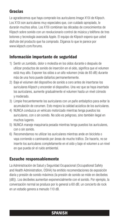 Información importante de seguridad 1) Sentir un zumbido, dolor o molestia en los oídos durante o después de utilizar productos de sonido de inserción en el oído, significa que el volumen está muy alto. Exponer los oídos a un alto volumen (más de 85 dB) durante más de una hora puede dañarlos permanentemente. 2) Baje el volumen del dispositivo de sonido a cero antes de insertarse los auriculares Klipsch y encender el dispositivo. Una vez que se haya insertado los auriculares, aumente gradualmente el volumen hasta un nivel cómodo y moderado. 3) Limpie frecuentemente los auriculares con un paño antiséptico para evitar la acumulación de cerumen. Esto mejora la calidad acústica de los auriculares. 4) N UNCA conduzca un vehículo motorizado mientras tenga puestos los auriculares, con o sin sonido. No sólo es peligroso, sino también ilegal en muchos lugares. 5) N UNCA maneje maquinaria pesada mientras tenga puestos los auriculares, con o sin sonido. 6) Recomendamos no utilizar los auriculares mientras ande en bicicleta o vaya corriendo o caminando por áreas de mucho tráfico. De hacerlo, no se inserte los auriculares completamente en el oído y baje el volumen a un nivel en que pueda oír el ruido ambiental.