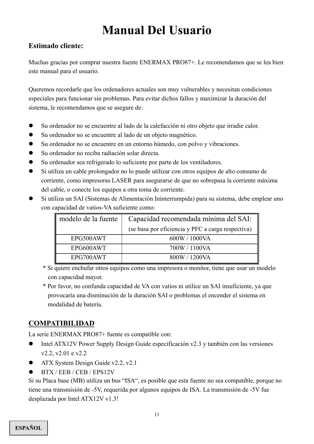 Muchas gratias por comprar nuestros fuente ENERMAX PRO87+. Le recomendamos que se lea bien estemanualparael usuario.