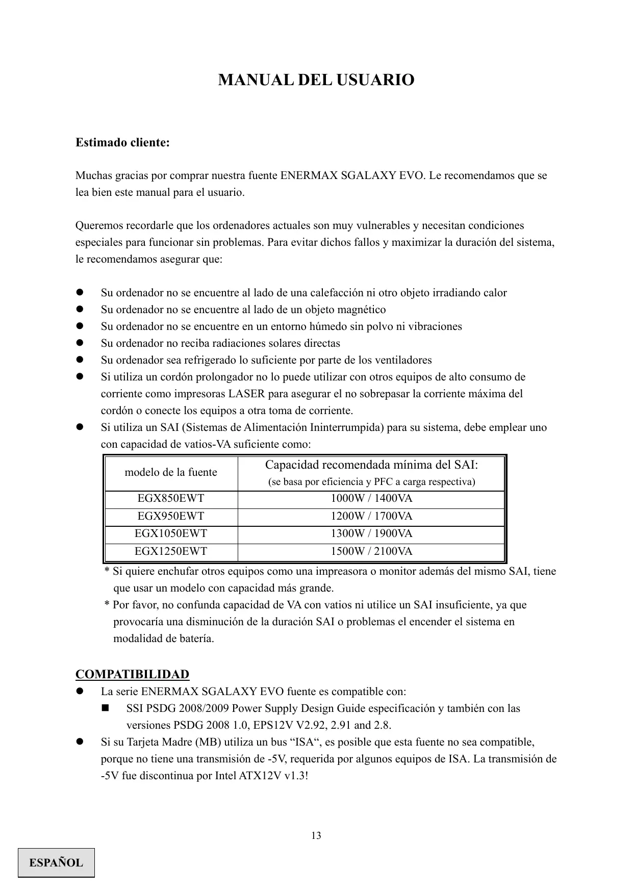 Muchas gracias por comprar nuestra fuente ENERMAX SGALAXY EVO. Le recomendamos que se lea bien este manual para el usuario. Queremos recordarle que los ordenadores actuales son muy vulnerables y necesitan condiciones especiales para funcionar sin problemas. Para evitar dichos fallos y maximizar la duración del sistema, le recomendamos asegurar que: Su ordenador no se encuentre al lado de una calefacción ni otro objeto irradiando calor Su ordenador no se encuentre al lado de un objeto magnético Su ordenador no se encuentre en un entorno húmedo sin polvo ni vibraciones Su ordenador no reciba radiaciones solares directas Su ordenador sea refrigerado lo suficiente por parte de los ventiladores Si utiliza un cordón prolongador no lo puede utilizar con otros equipos de alto consumo de corriente como impresoras LASER para asegurar el no sobrepasar la corriente máxima del cordón o conecte los equipos a otra toma de corriente. Si utiliza un SAI (Sistemas de Alimentación Ininterrumpida) para su sistema, debe emplear uno con capacidad de vatios-VA suficiente como: modelo de la fuente