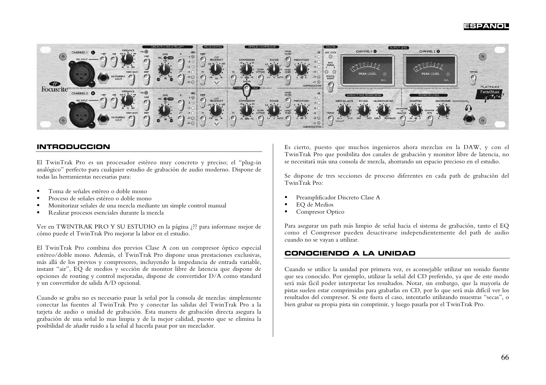 ESPAÑOL INTRODUCCION El TwinTrak Pro es un procesador estéreo muy concreto y preciso; el “plug-in analógico” perfecto para cualquier estudio de grabación de audio moderno. Dispone de todas las herramientas necesarias para: