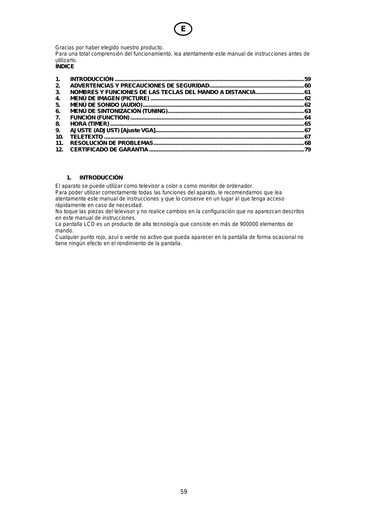 INTRODUCCIÓN El aparato se puede utilizar como televisor a color o como monitor de ordenador. Para poder utilizar correctamente todas las funciones del aparato, le recomendamos que lea atentamente este manual de instrucciones y que lo conserve en un lugar al que tenga acceso rápidamente en caso de necesidad. No toque las piezas del televisor y no realice cambios en la configuración que no aparezcan descritos en este manual de instrucciones. La pantalla LCD es un producto de alta tecnología que consiste en más de 900000 elementos de mando. Cualquier punto rojo, azul o verde no activo que pueda aparecer en la pantalla de forma ocasional no tiene ningún efecto en el rendimiento de la pantalla.