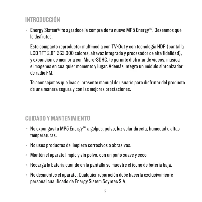 ≥≥ No expongas tu MP5 Energy™ a golpes, polvo, luz solar directa, humedad o altas temperaturas. ≥≥ No uses productos de limpieza corrosivos o abrasivos. ≥≥ Mantén el aparato limpio y sin polvo, con un paño suave y seco. ≥≥ Recarga la batería cuando en la pantalla se muestre el ícono de batería baja. ≥≥ No desmontes el aparato. Cualquier reparación debe hacerla exclusivamente personal cualificado de Energy Sistem Soyntec S.A.