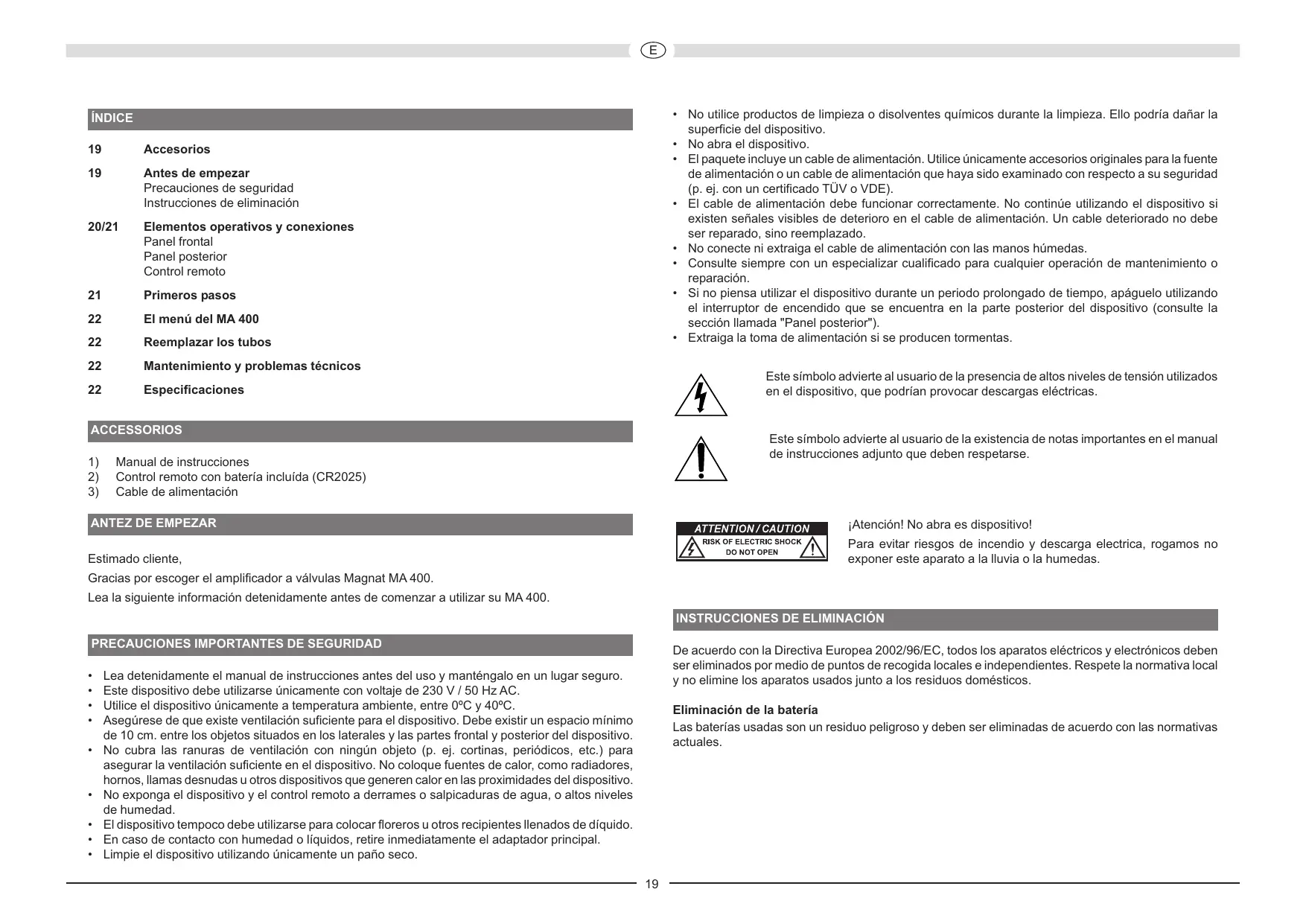 ¡Atención! No abra es dispositivo! Para evitar riesgos de incendio y descarga electrica, rogamos no exponer este aparato a la lluvia o la humedas. Estimado cliente, Gracias por escoger el amplificador a válvulas Magnat MA 400. Lea la siguiente información detenidamente antes de comenzar a utilizar su MA 400.