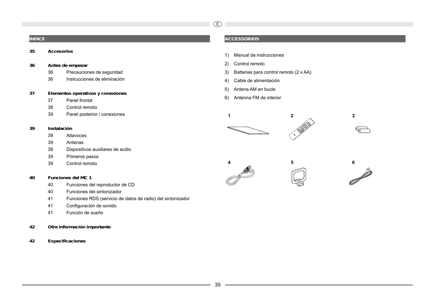 Auriculares Puede conectar unos auriculares utilizando el conector estéreo de 3,5 mm situado en el panel frontal del MC 1. Antes de hacerlo, fije el volumen a VOL 00. El sonido de los altavoces se desconectará automáticamente al insertar los auriculares. ¡Recuerde que escuchar música con los auriculares a un nivel de volumen muy alto podría causar daños irreparables en el oído! Ecualización: Bajos Agudos Sintonizador FM Line in (panel frontal) Se utiliza para conectar una fuente de audio con un conector estéreo de 3,5 mm. Las demás conexiones analógicas del panel posterior del MC 1 han sido diseñadas para cables RCA. Si tiene alguna duda, consulte el manual de instrucciones del dispositivo. Respuesta de frecuencia :