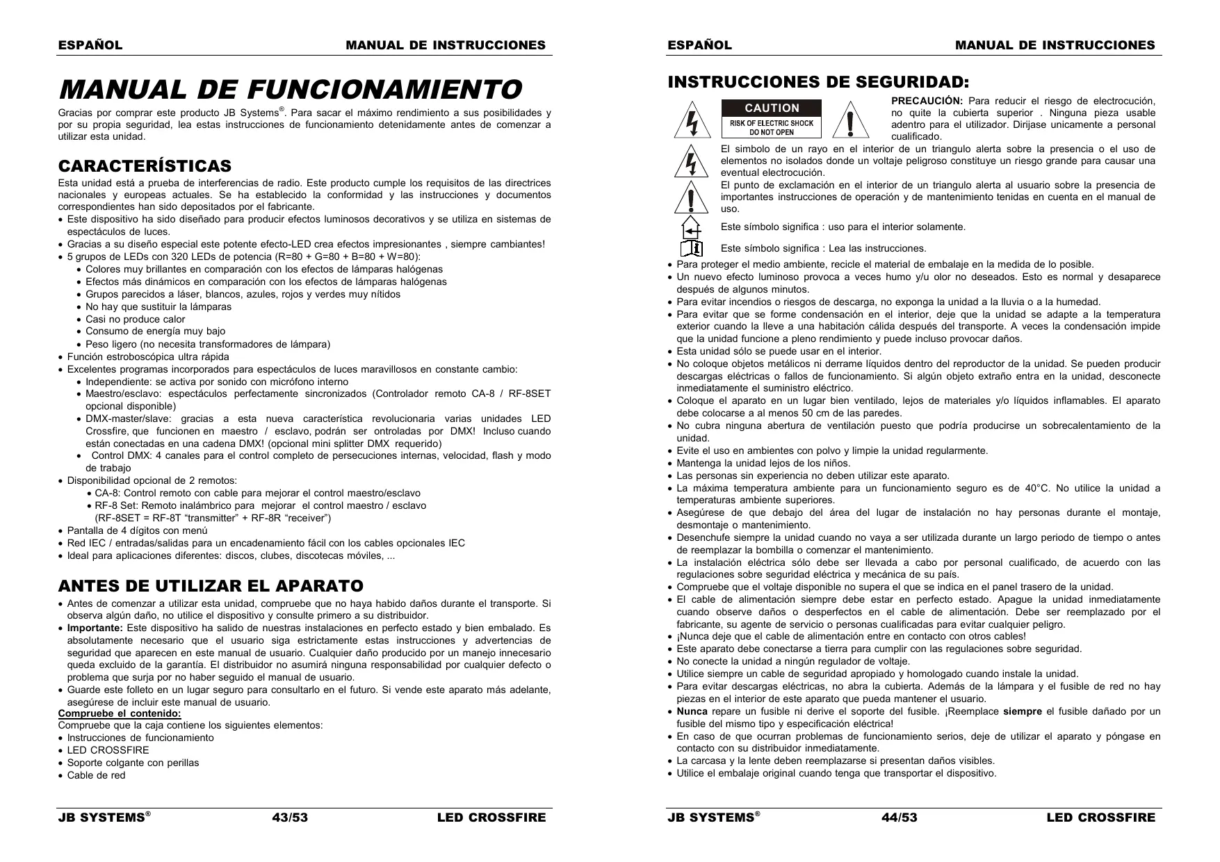 Gracias por comprar este produit JB Systems. Para sacar el máximo rendimiento a sus posibilidades y por su propia seguridad, lea estas instrucciones de funciona bajo的前提下 de comendar a utiliser estaupon.