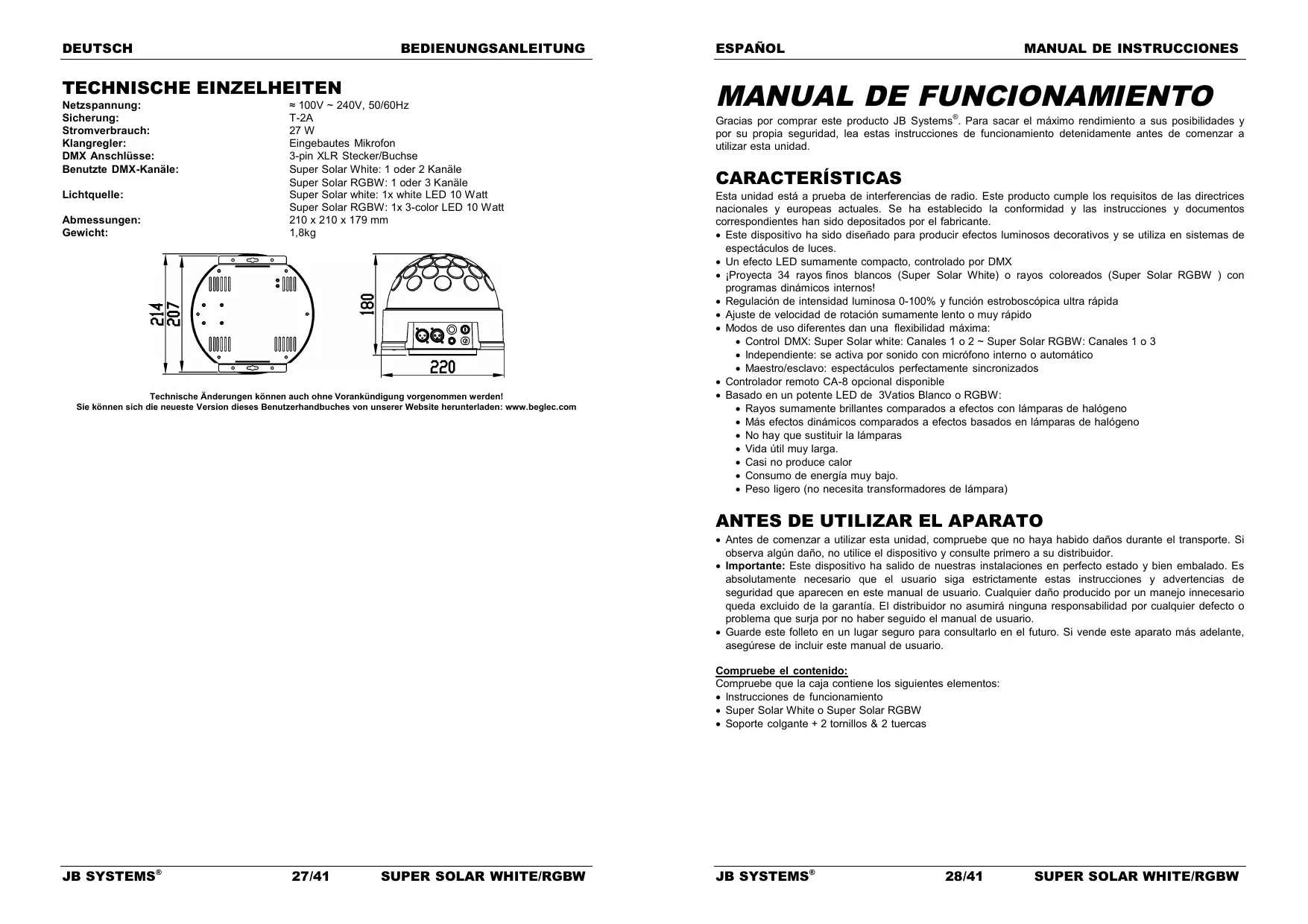 Gracias por comprar este producto JB Systems. Para sacar el máximo rendimiento a sus posibilidades y por su propia seguridad, lea estas instrucciones de funcionalement detenidamente antes de comenzar a utiliser esta unidad.