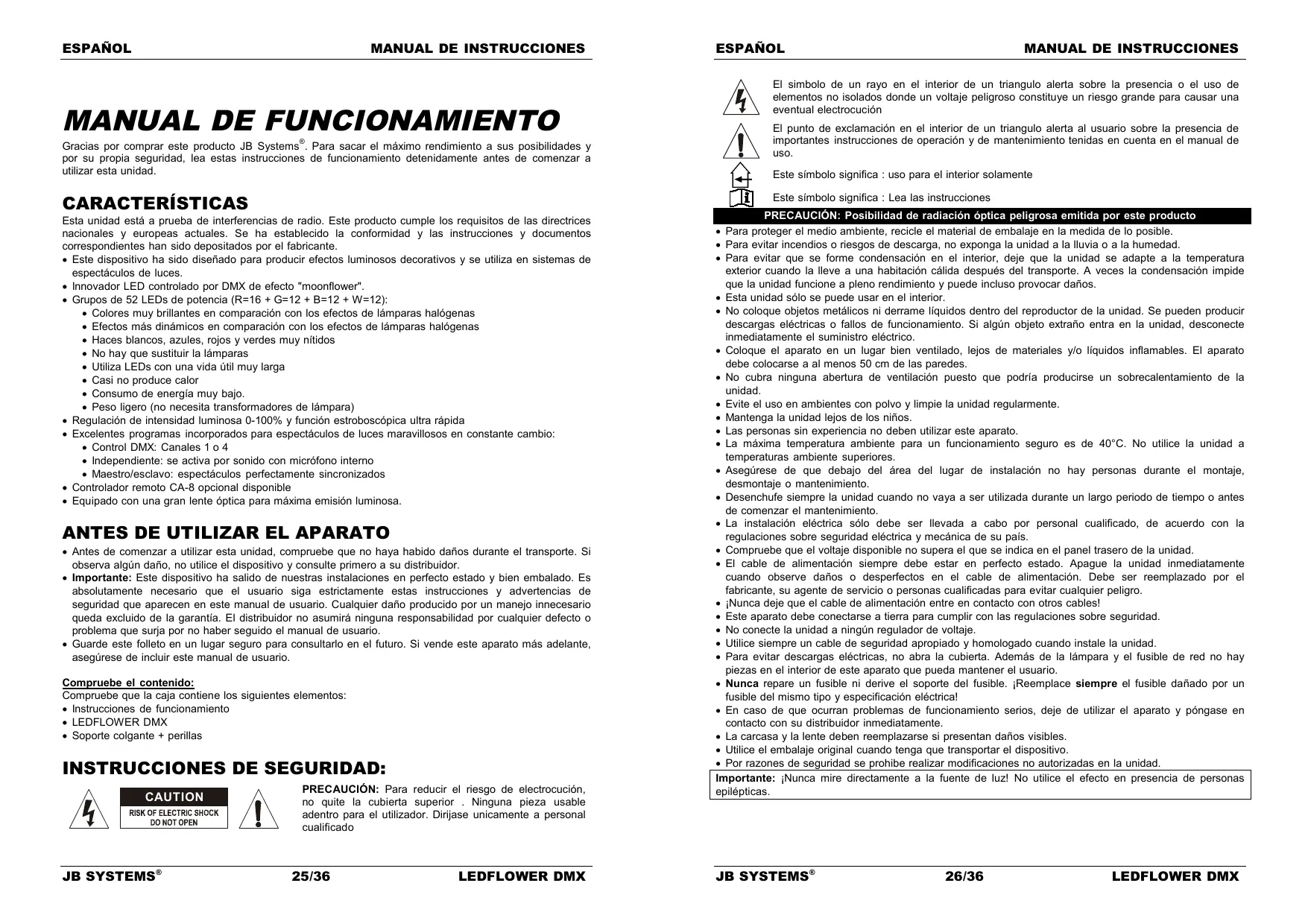 Gracias por comprar este producto JB Systems. Para sacar el máximo rendimiento a sus posibilidades y por su propia seguridad, lea estas instrucciones de funciona bajo的前提下 de comenzar a utiliser estaupon.